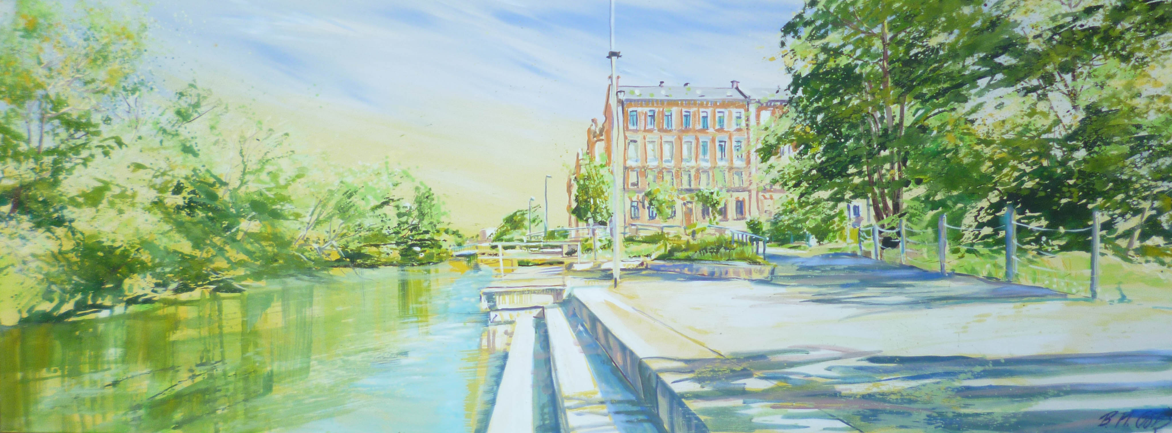 Gemälde von Birgit Maria Götz: Ende Flussbad (70 x 185), 2017; Quelle/Foto: Birgit Maria Götz (Veröffentlichungsgenehmigung für FürthWiki vom 13.12.2017)