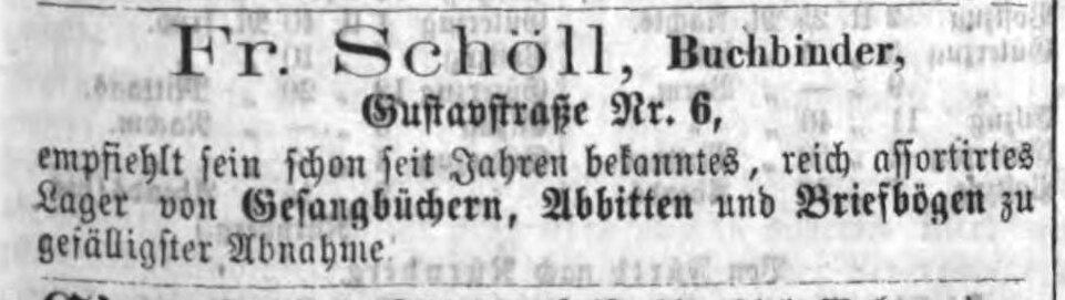 | Beschreibung | Anzeige Schöll Gustavstr 6, Fürther Tagblatt 9. März 1861 | ||