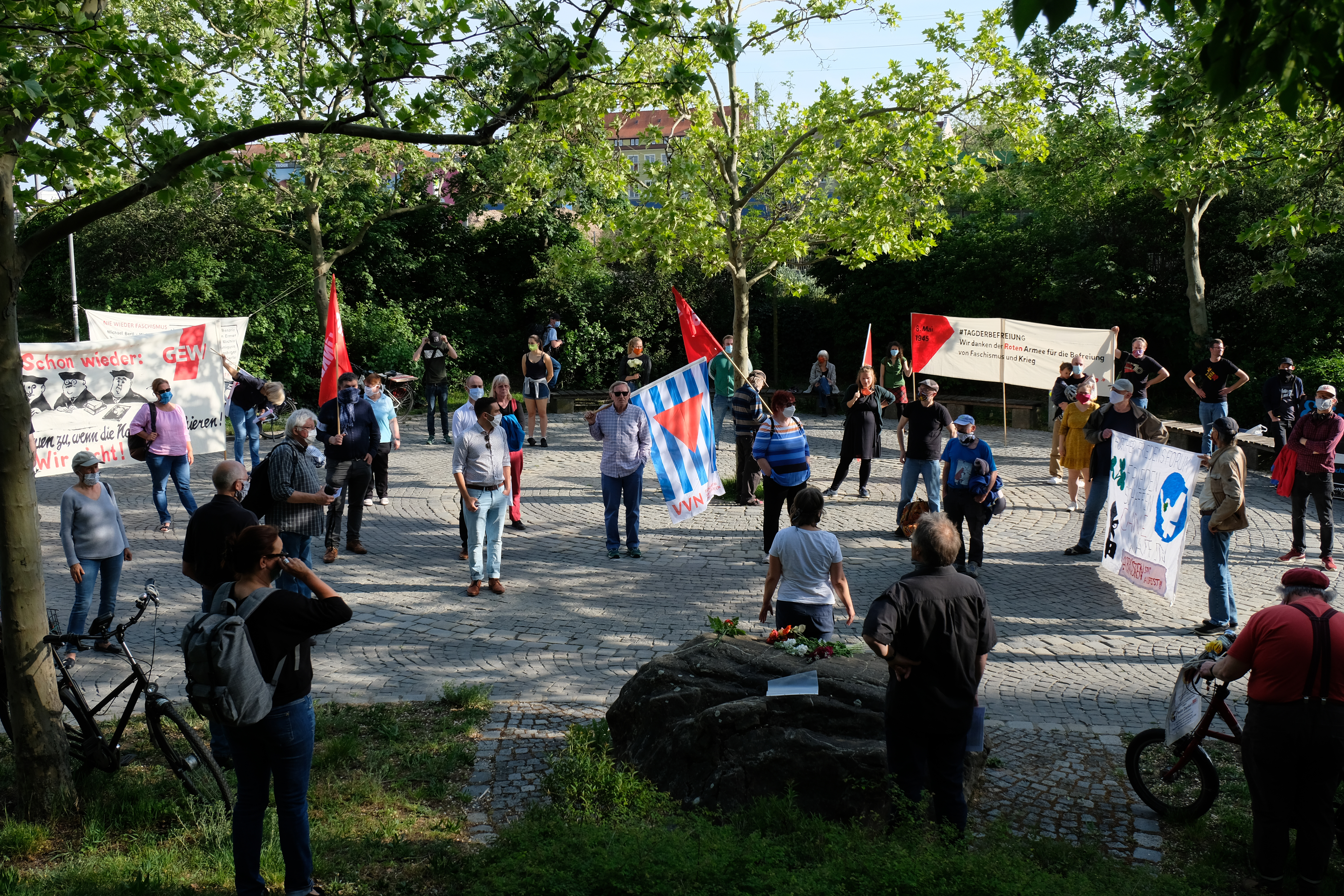 | Beschreibung | Kundgebung anlässlich des 75jährigen Kriegsende am Platz der Opfer des Faschismus - unter Auflagen der COVID-19-Pandemie, Mai 2020 | ||