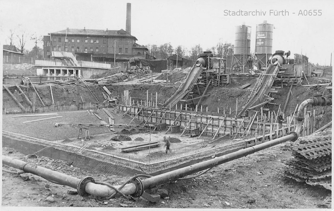 | Beschreibung | Bau des Sommerbades am Scherbsgraben, im Hintergrund die ehemalige Leimfabrik Bernhard Ochs ("Leimsud") | ||