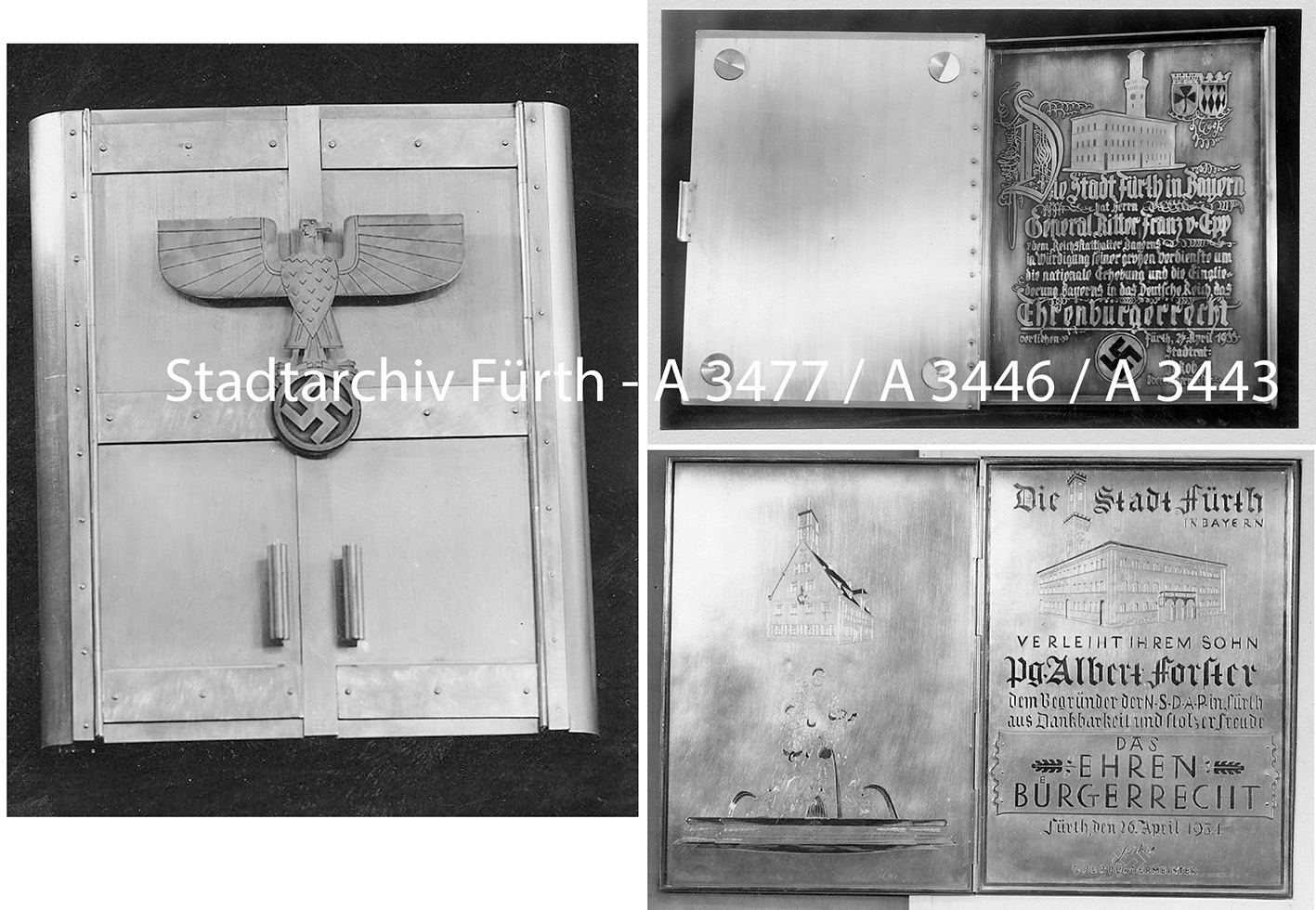 | Beschreibung | NS-Ehrenbürger während des Nationalsozialismus, hier der Ehrenbrief von A. Hitler, A. Forster und F. von Epp. | ||