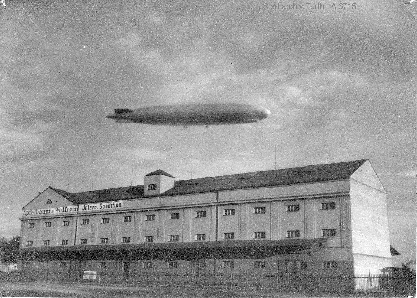| Beschreibung | Lagerhalle mit Gleisanschluss der Spedition Apfelbaum & Wolfram 1928 in der Karolinenstraße 146. Im Hintergrund ein Zeppelin auf der Fahrt zurück von Berlin | ||