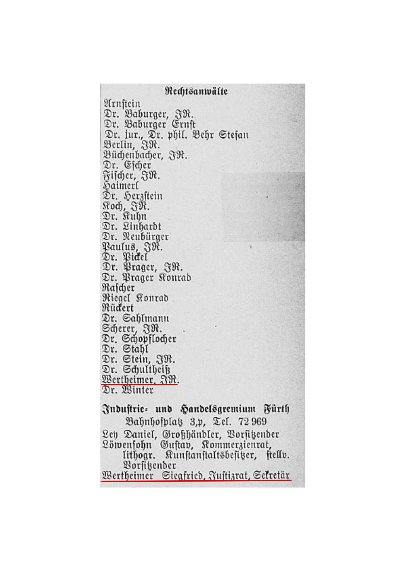 Rechtsanwalt Siegfried Wertheimer, Friedrichstraße 18; Quelle: Adressbuch Fürth i. B. 1931, III. Teil, S. 21