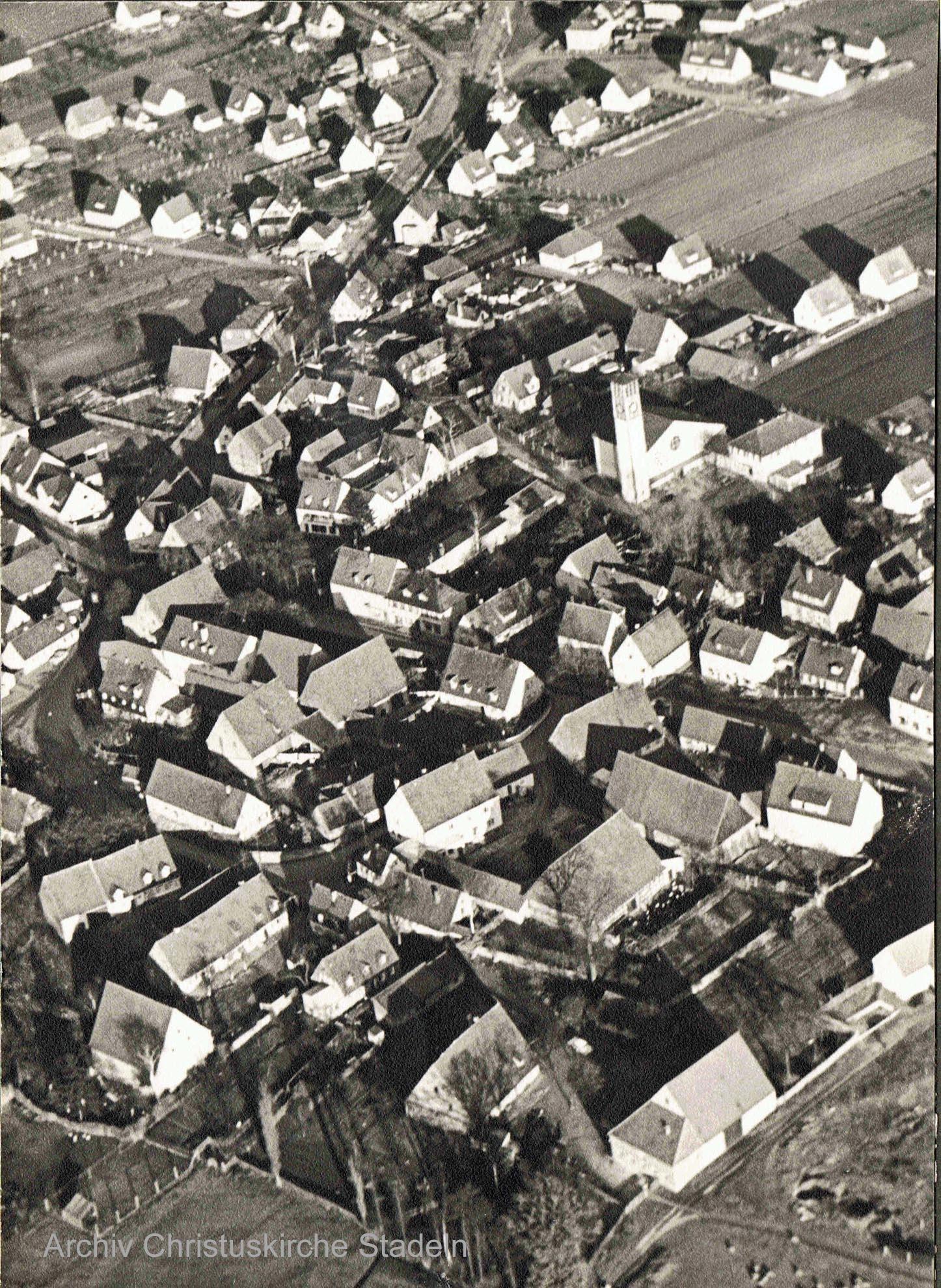 | Dateiinfo (Bild-Unterschrift und Info-Box, automatisch erstellt) | Stadeln mit Christuskirche, im Vordergrund der alte Ortskern, Luftaufnahme von 1959 Lizenz: CC BY-SA 3.0 | ||