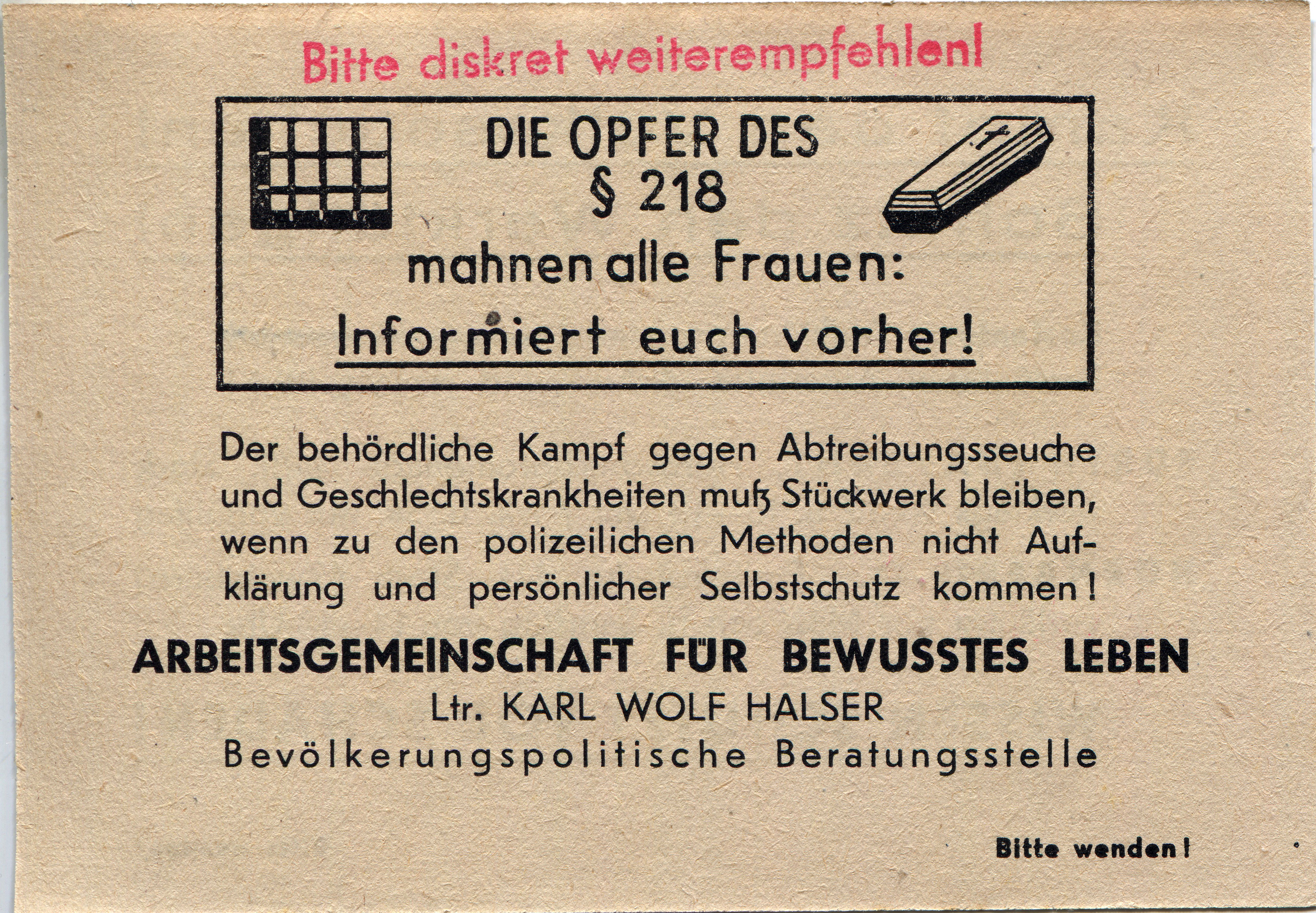 | Dateiinfo (Bild-Unterschrift und Info-Box, automatisch erstellt) | Flyer der "Arbeitsgemeinschaft für bewusstes Leben" für die Gleichstellung der Frau und Abschaffung ... Flyer der "Arbeitsgemeinschaft für bewusstes Leben" für die Gleichstellung der Frau und Abschaffung des § 218, ca. 1930<br>Urheber: Karl Wolf Halser<br><br>Lizenz: CC BY-SA 3.0 | ||