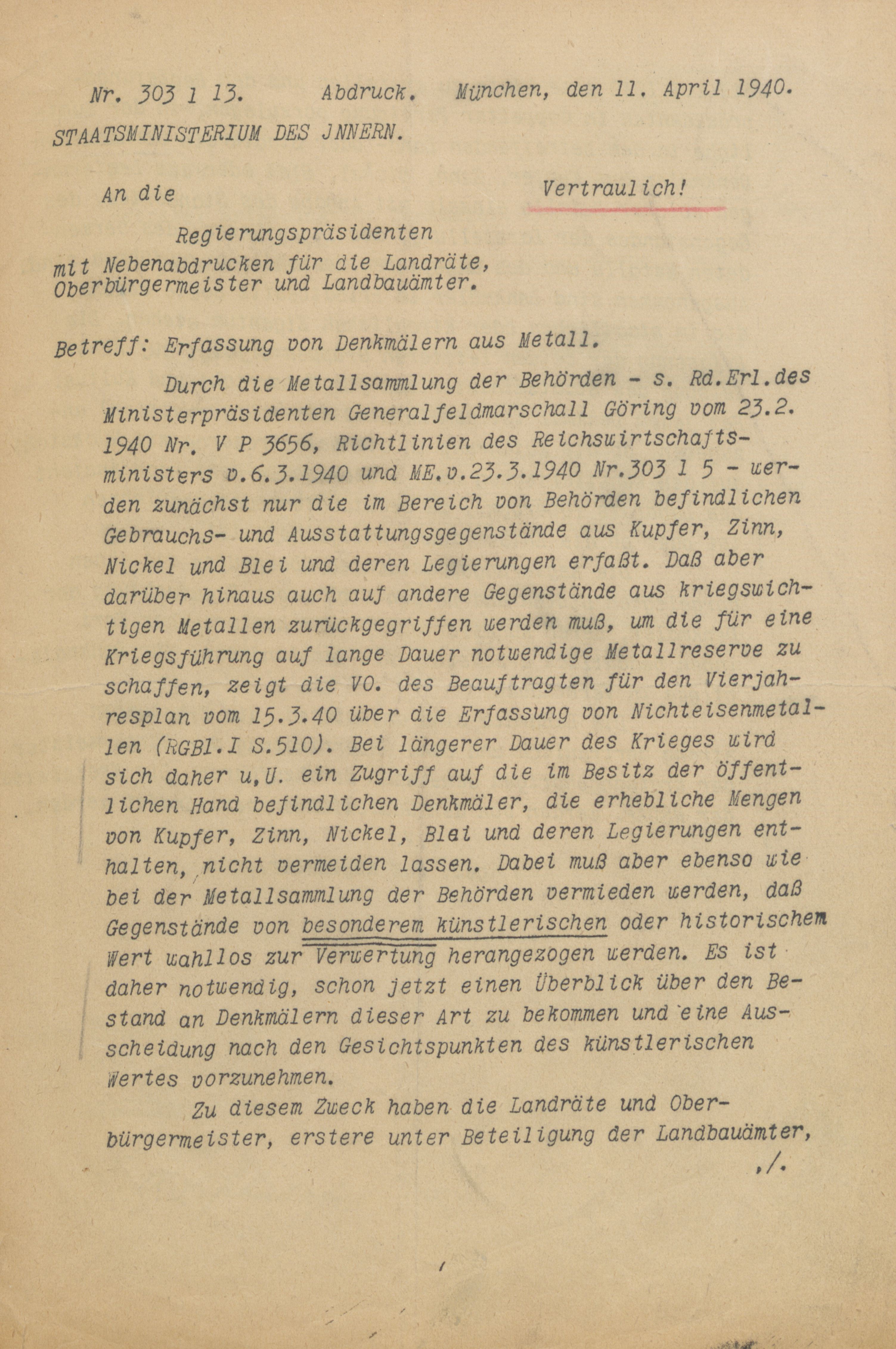 | Beschreibung | Erfassung von Denkmälern aus Metall, Schreiben des Innenministeriums, Seite 1 | ||