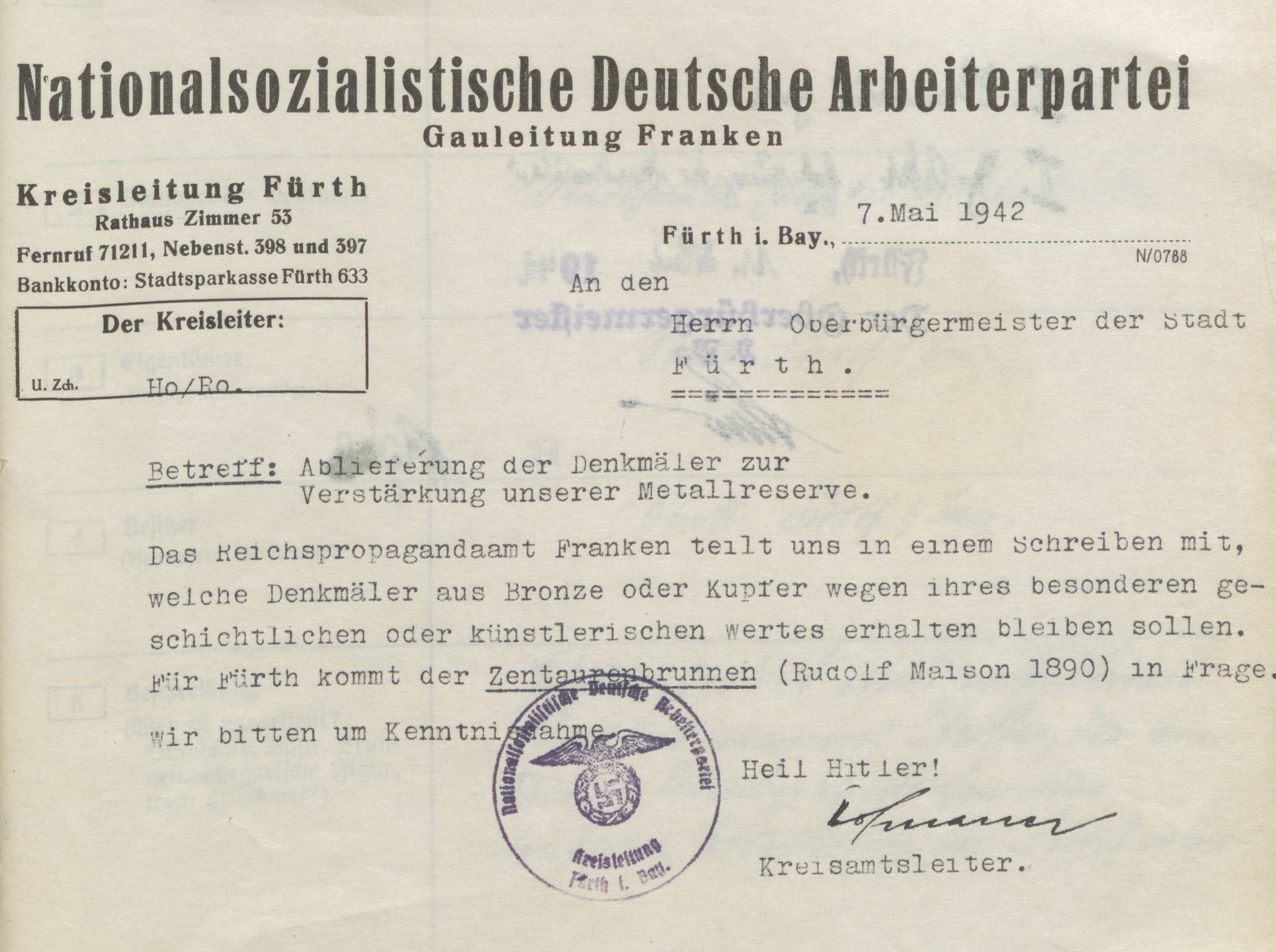 | Dateiinfo (Bild-Unterschrift und Info-Box, automatisch erstellt) | Bescheid über die Erhaltung des Zentaurenbrunnens 1942 Urheber: Stadt Fürth<br><br>Lizenz: Bildlizenz-Stadtarchiv | ||