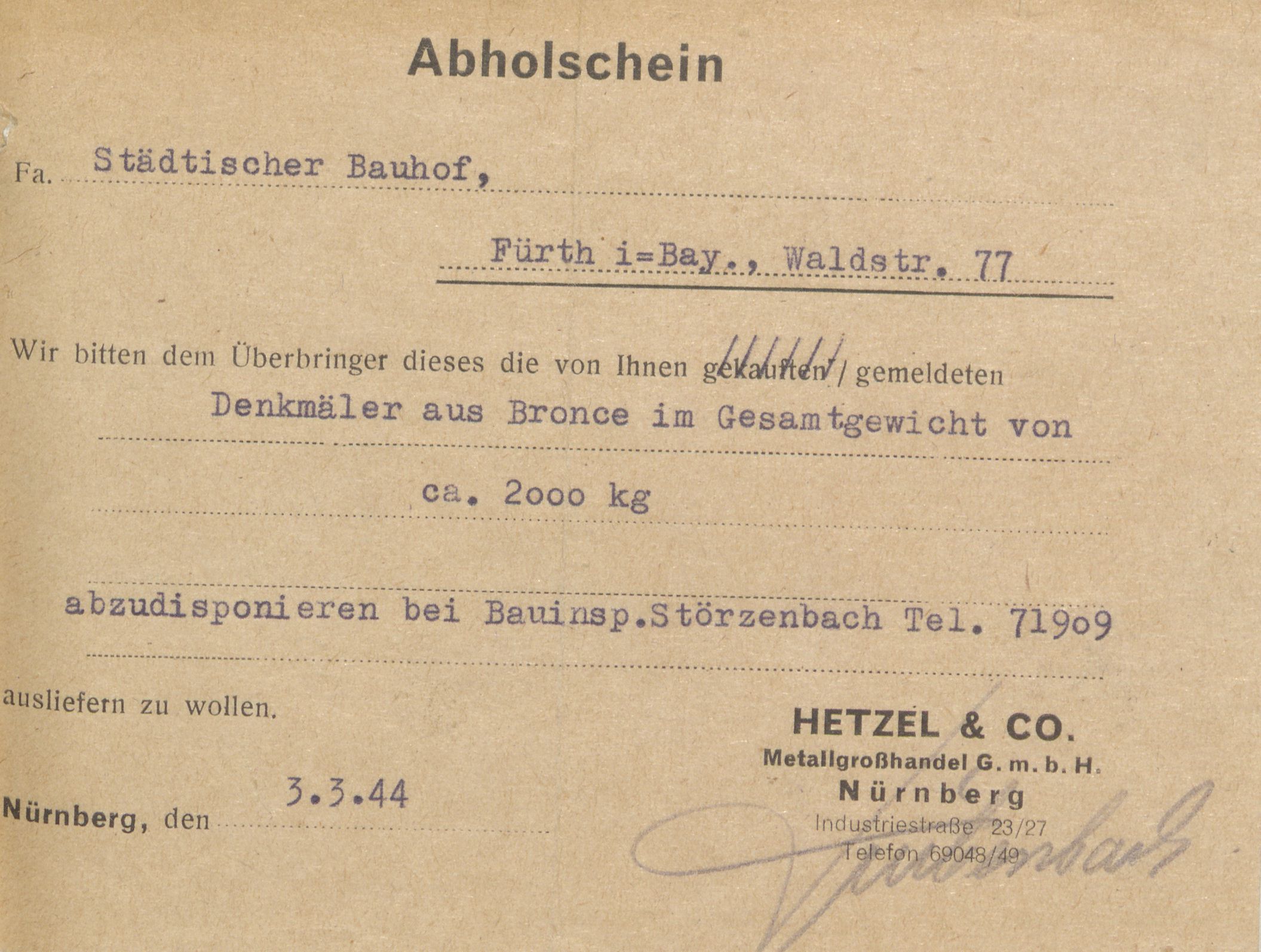 | Dateiinfo (Bild-Unterschrift und Info-Box, automatisch erstellt) | Abholschein für die Denkmäler 1944 Urheber: Stadt Fürth<br><br>Lizenz: Bildlizenz-Stadtarchiv | ||