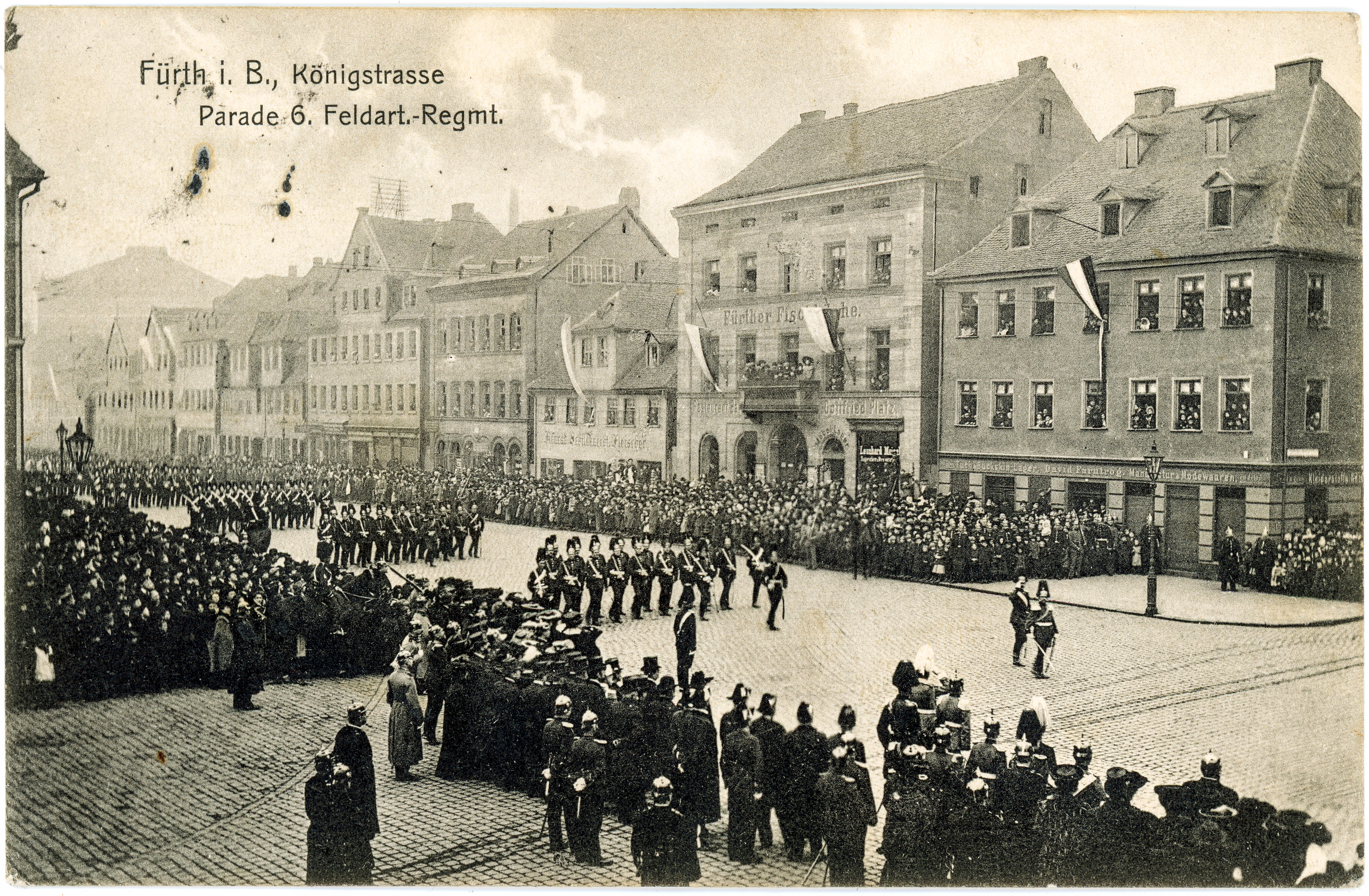 | Beschreibung | Parade des 6. Feldartillerie-Regiments in der Königstraße anlässlich des 89. Geburtstags Prinzregent Luitpolds, gel. 1908 | ||