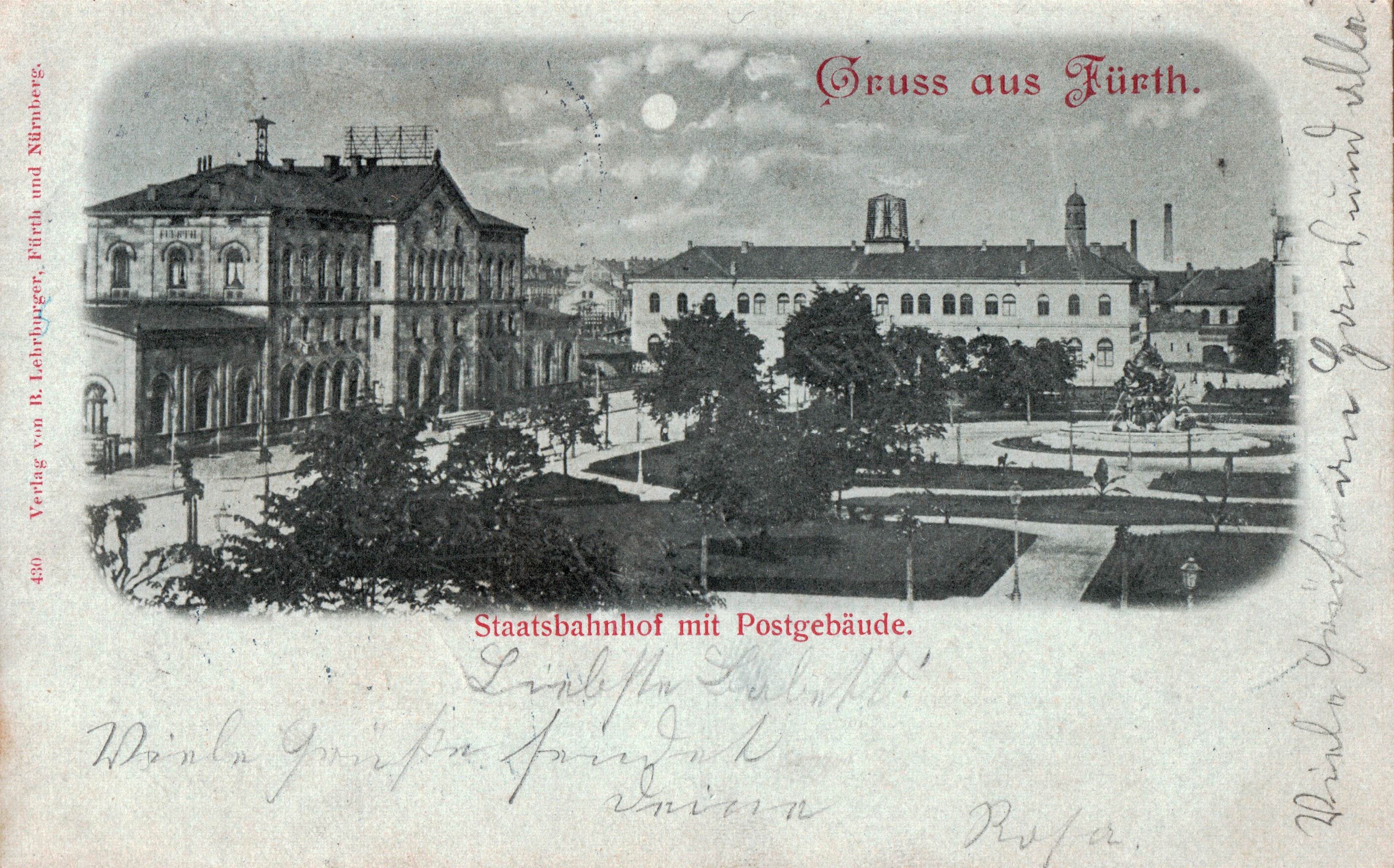 | Dateiinfo (Bild-Unterschrift und Info-Box, automatisch erstellt) | Historische Ansichtskarte "Staatsbahnhof mit Postgebäude", um 1898 Urheber: B. Lehrburger<br><br><br>Lizenz: CC BY-SA 3.0 | ||