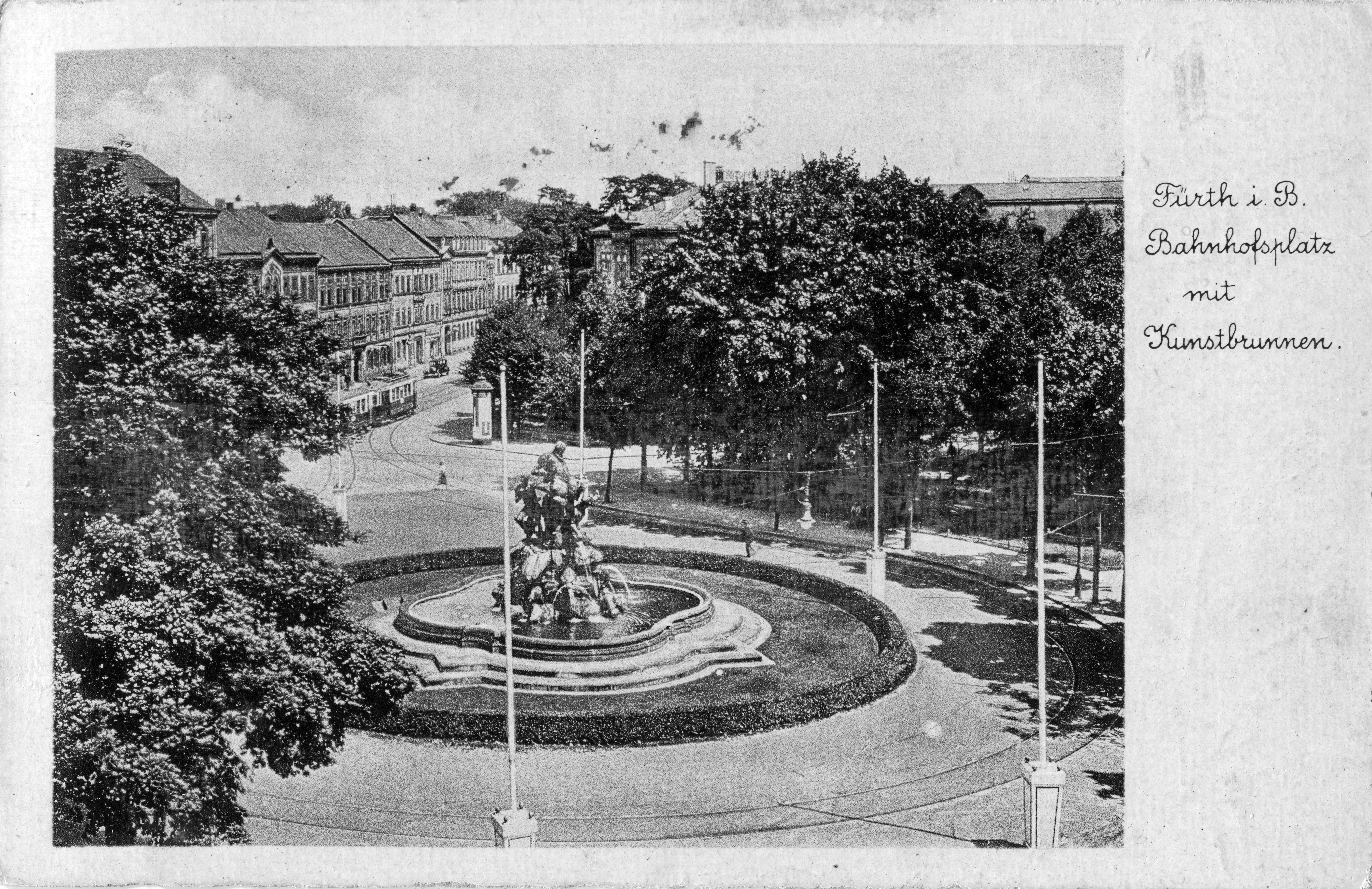 | Beschreibung | Ansichtskarte vom Fürther Bahnhofplatz, Wendeschleife der Straßenbahn und dem Centaurenbrunnen ca. 1934 | ||