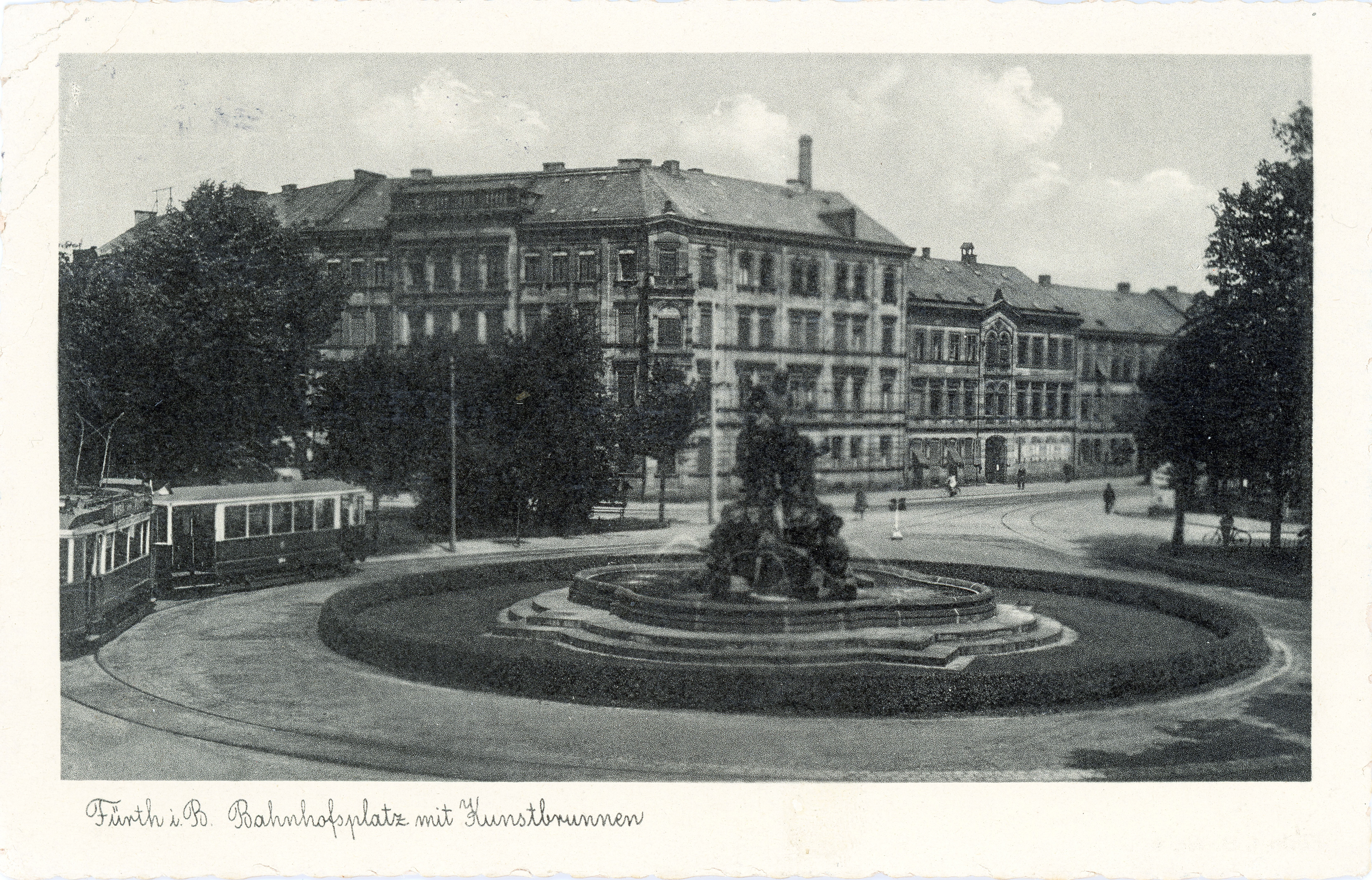 | Beschreibung | Ansichtskarte vom Centaurenbrunnen mit Straßenbahnschleife am Bahnhofplatz. Im Hintergrunde die Häuser Gustav-Schickedanz-Straße 10, Gustav-Schickedanz-Straße 8, gel. 1935 | ||