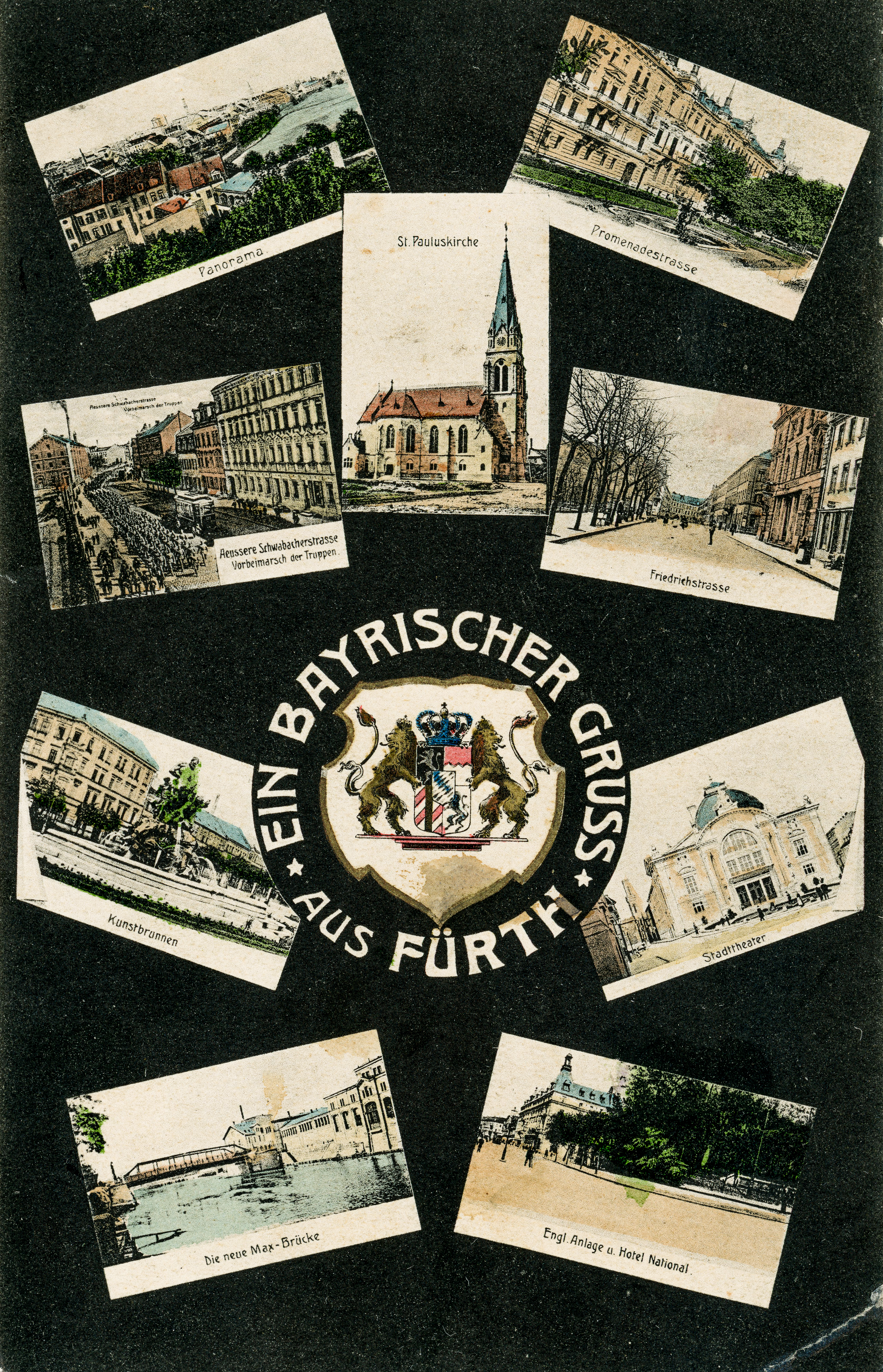 | Dateiinfo (Bild-Unterschrift und Info-Box, automatisch erstellt) | Postkarte mit zeitgenössischen Ansichtskartenmotive aus der Stadt Fürth, so z. B. das Theater, die ... Postkarte mit zeitgenössischen Ansichtskartenmotive aus der Stadt Fürth, so z. B. das Theater, die Max-Brücke, Hotel-National, Centaurenbrunnen, Hornschuchpromenade etc, gel. 1906<br>Urheber: unbekannt<br><br>Lizenz: CC BY-SA 3.0 | ||