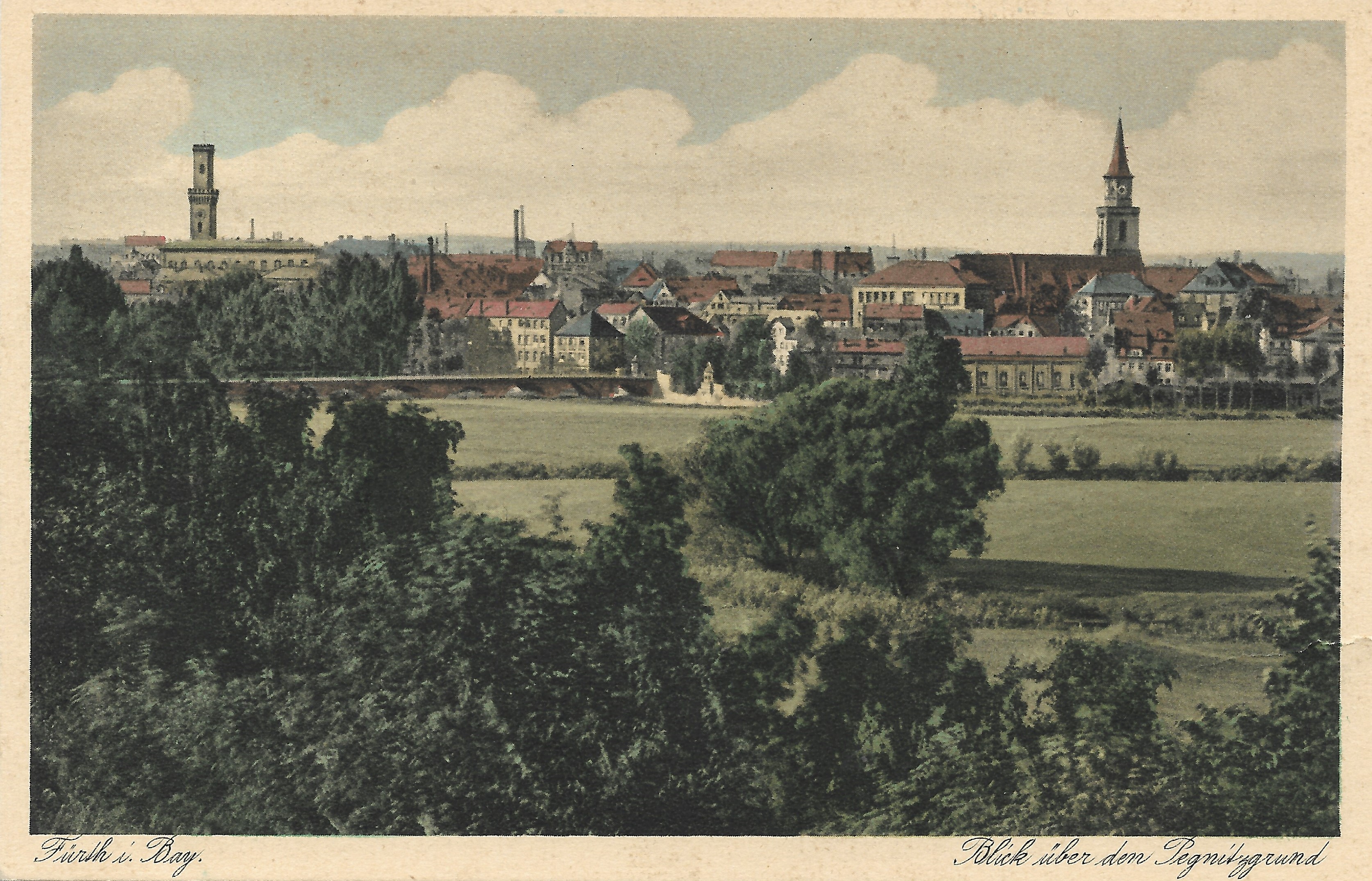 | Beschreibung | Historische Ansichtskarte "Blick über den Pegnitzgrund", ungel., im Hintergrund die Altstadt mit Michaelskirche und Rathaus | ||