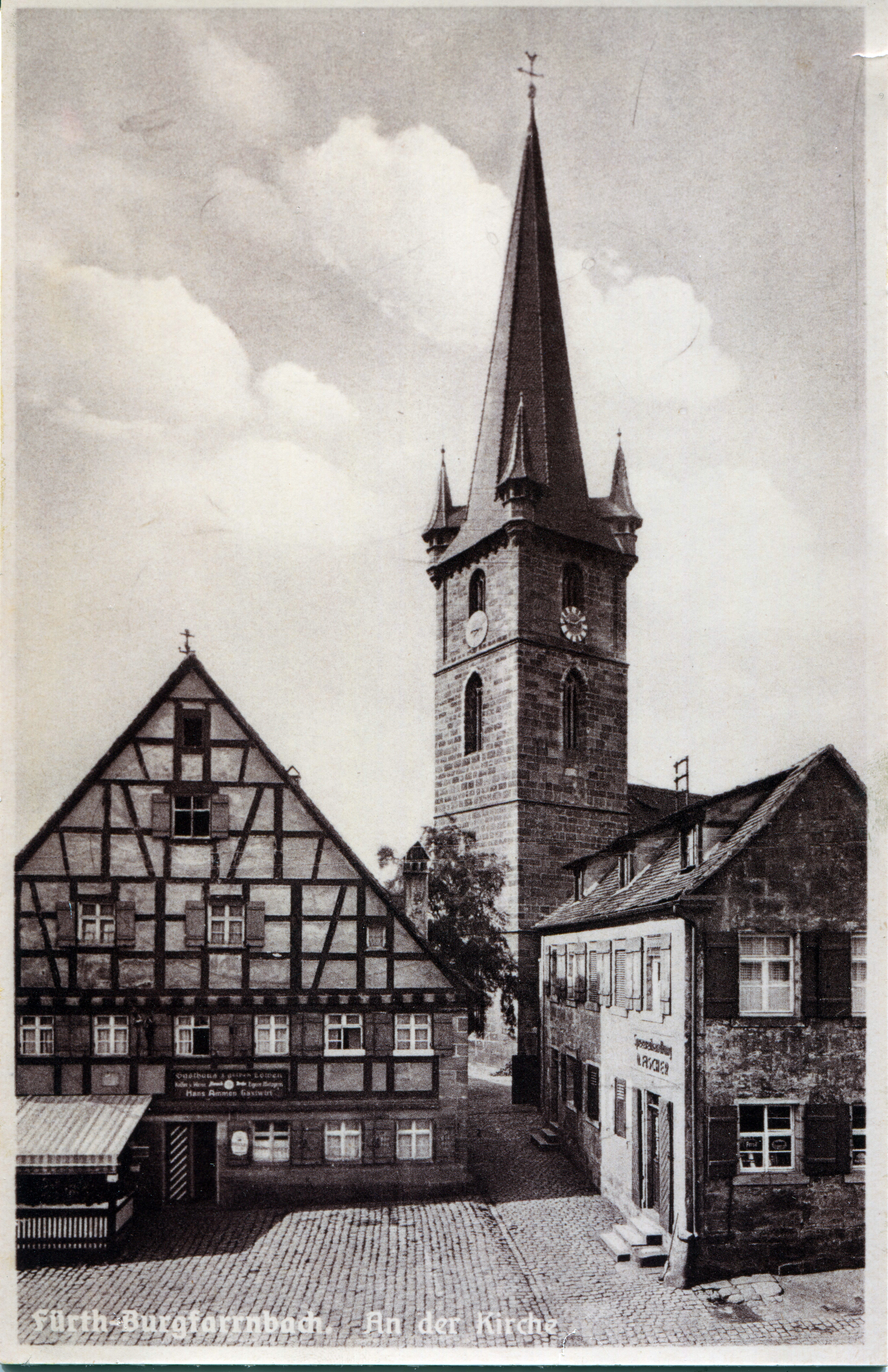 | Beschreibung | Blick auf die Kirche St. Johannis und Gaststätte Zum Gelben Löwen in Burgfarrnbach, ca. 1950 | ||