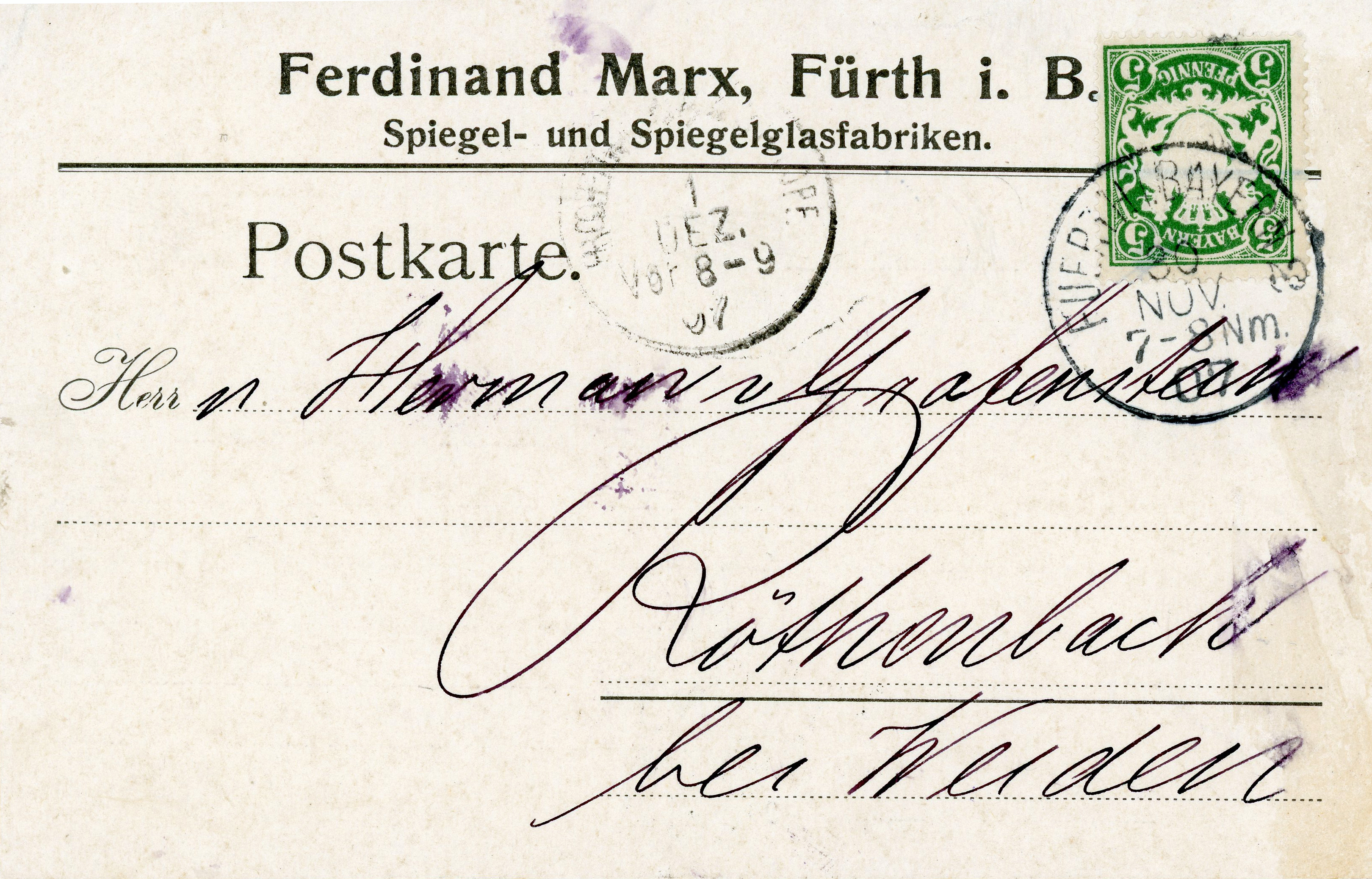| Beschreibung | Anzeigekarte der Spiegel- und Spiegelglasfabrik Ferdinand Marx, Nov. 1907 | ||