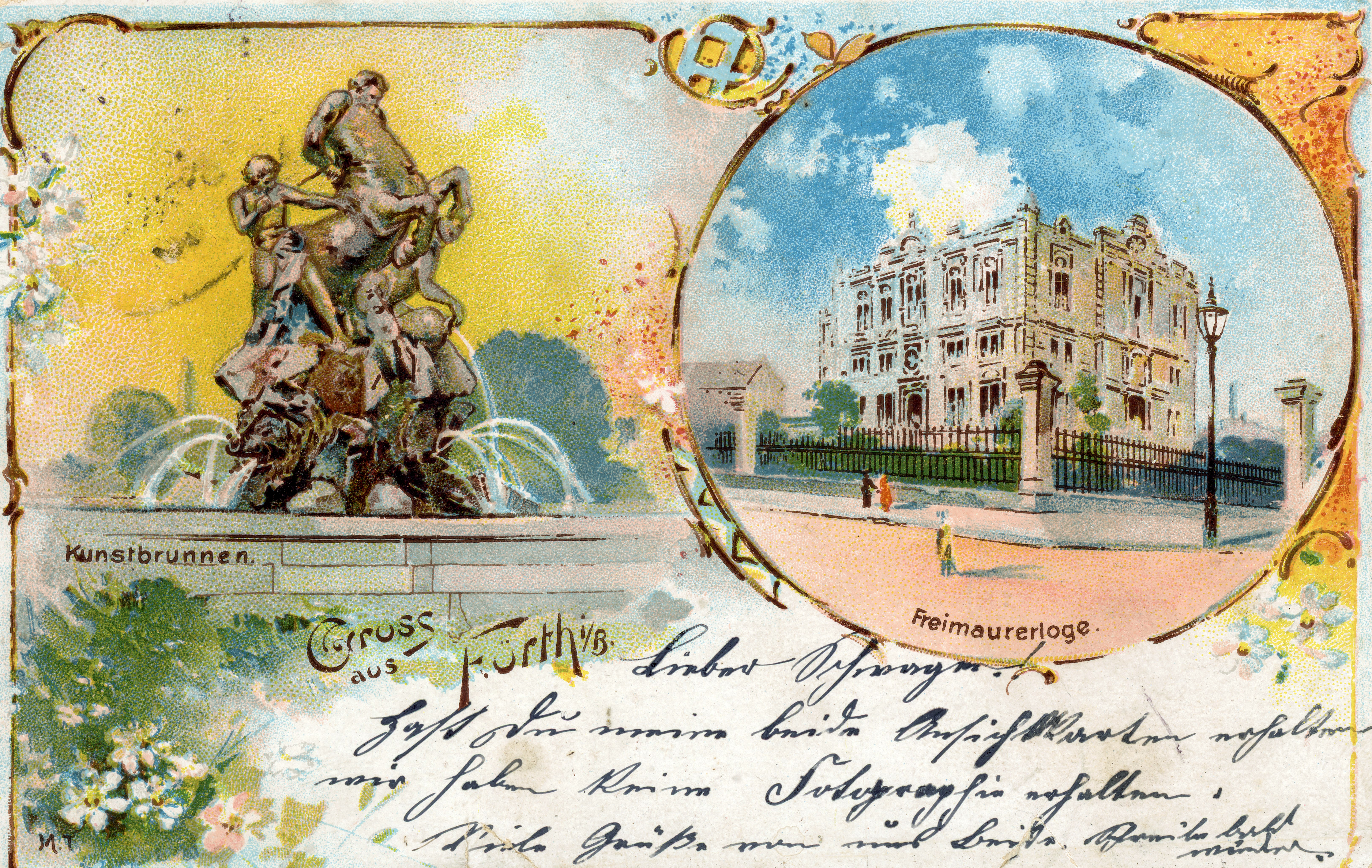 | Dateiinfo (Bild-Unterschrift und Info-Box, automatisch erstellt) | Ansichtskarte mit Logenhaus / Freimaurer und Kunstbrunnen, gel. 1900 Urheber: unbekannt<br><br>Lizenz: CC BY-SA 4.0 | ||