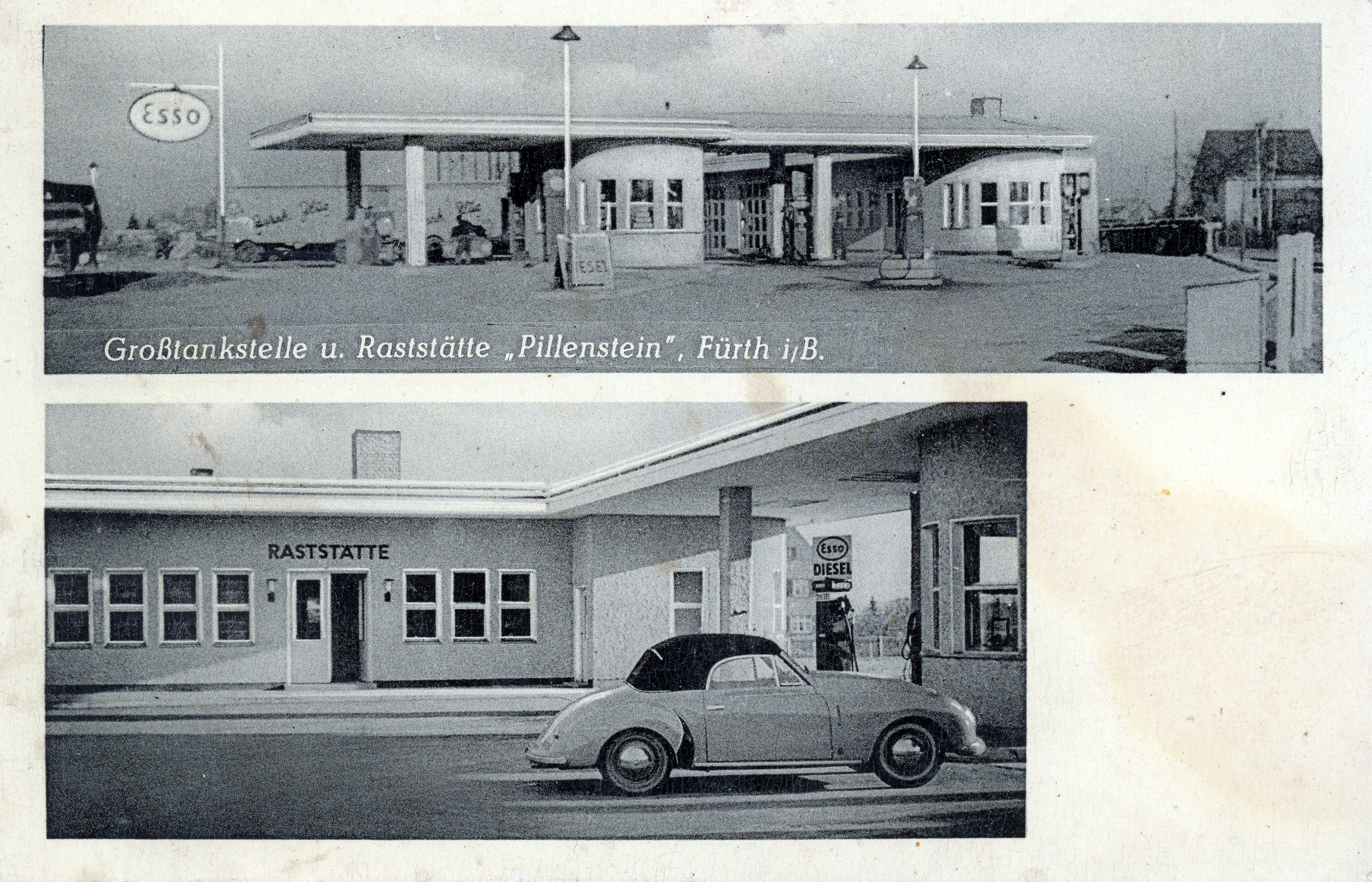 | Beschreibung | Ansichtskarte Autohaus und Tankstelle Pillenstein an der Würzburger Straße, ngl. ca. 1950 | ||
