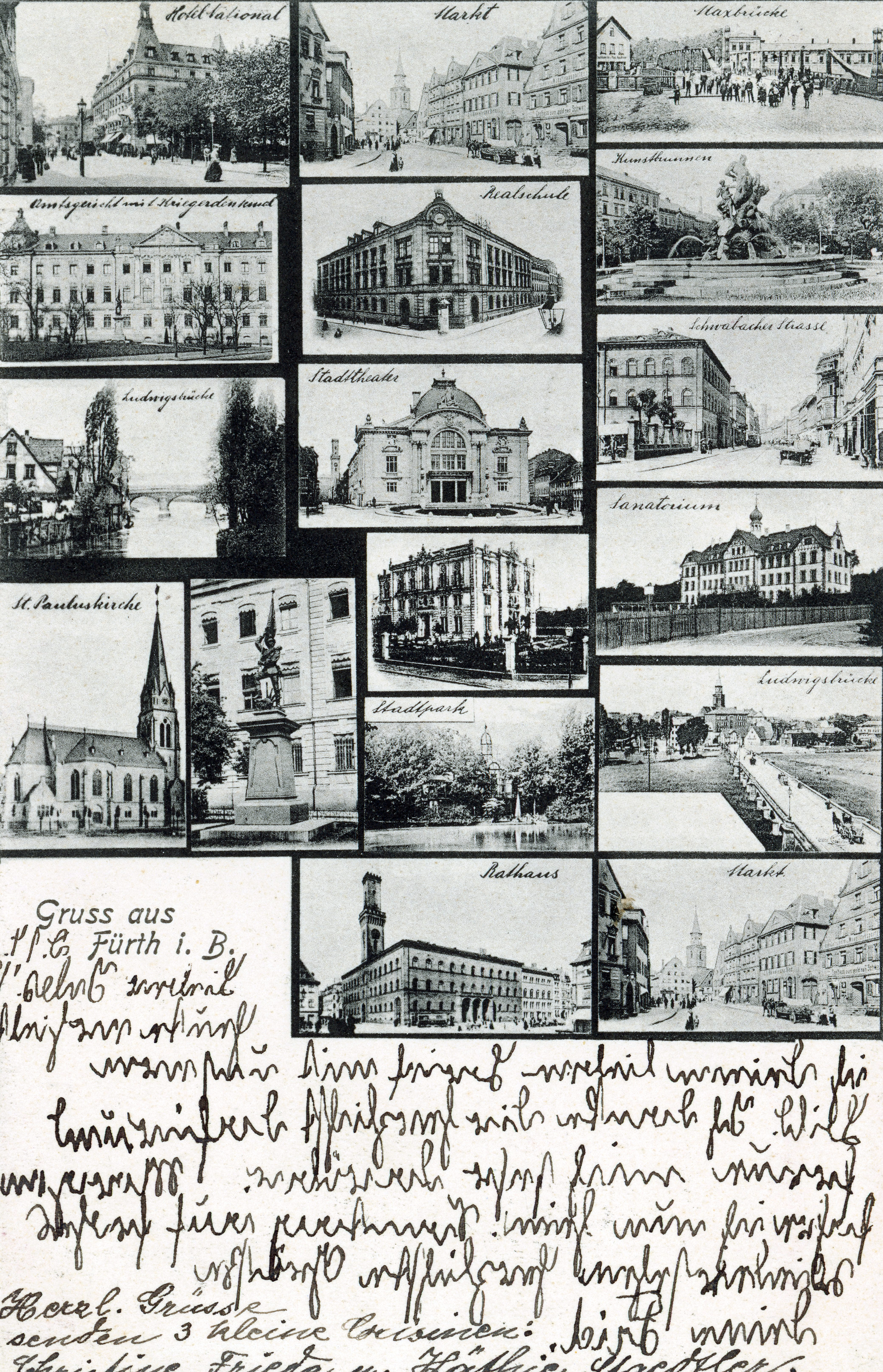 | Beschreibung | Gruß aus Fürth mit verschiedenen Motiven, gel. Dez 1904 | ||