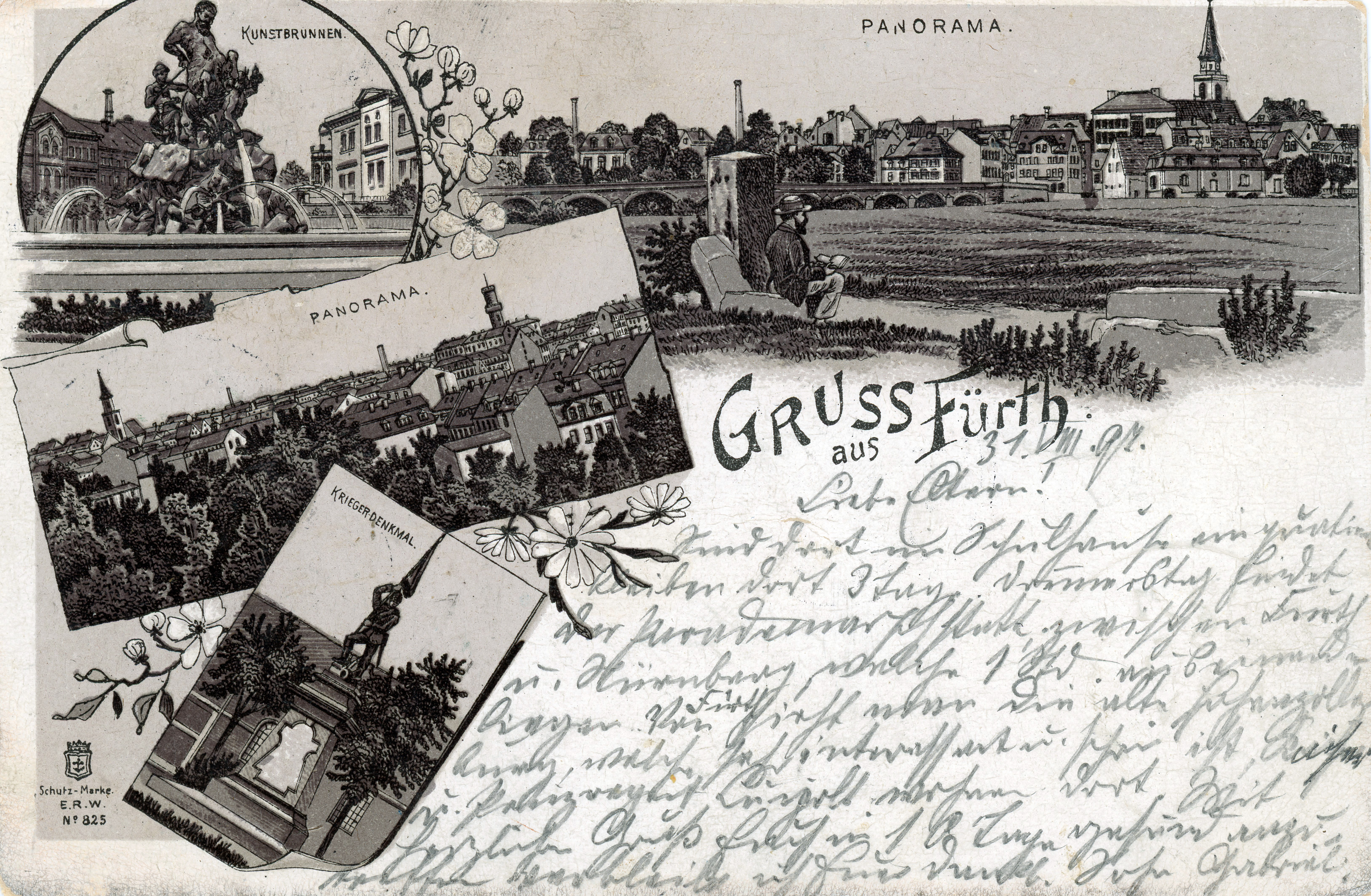 | Dateiinfo (Bild-Unterschrift und Info-Box, automatisch erstellt) | Ansichtskarte mit Grüßen aus Fürth, gel. Sept. 1897 Urheber: unbekannt<br><br>Lizenz: CC BY-SA 4.0 | ||
