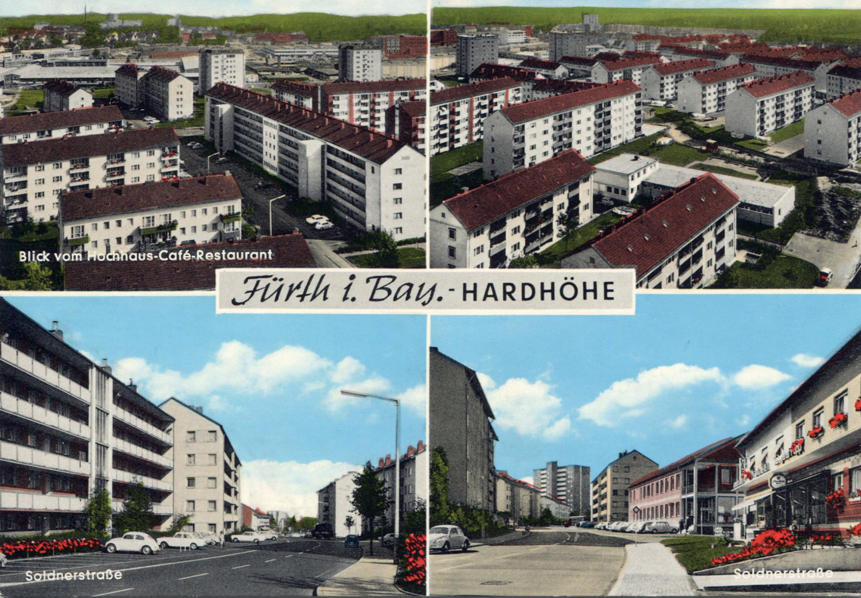 | Beschreibung | Ansichtskarte der Hardhöhe, rechts unten: Polizeiwache Soldnerstraße, Bäckerei Wölfel (Filiale), ca. 1960 | ||