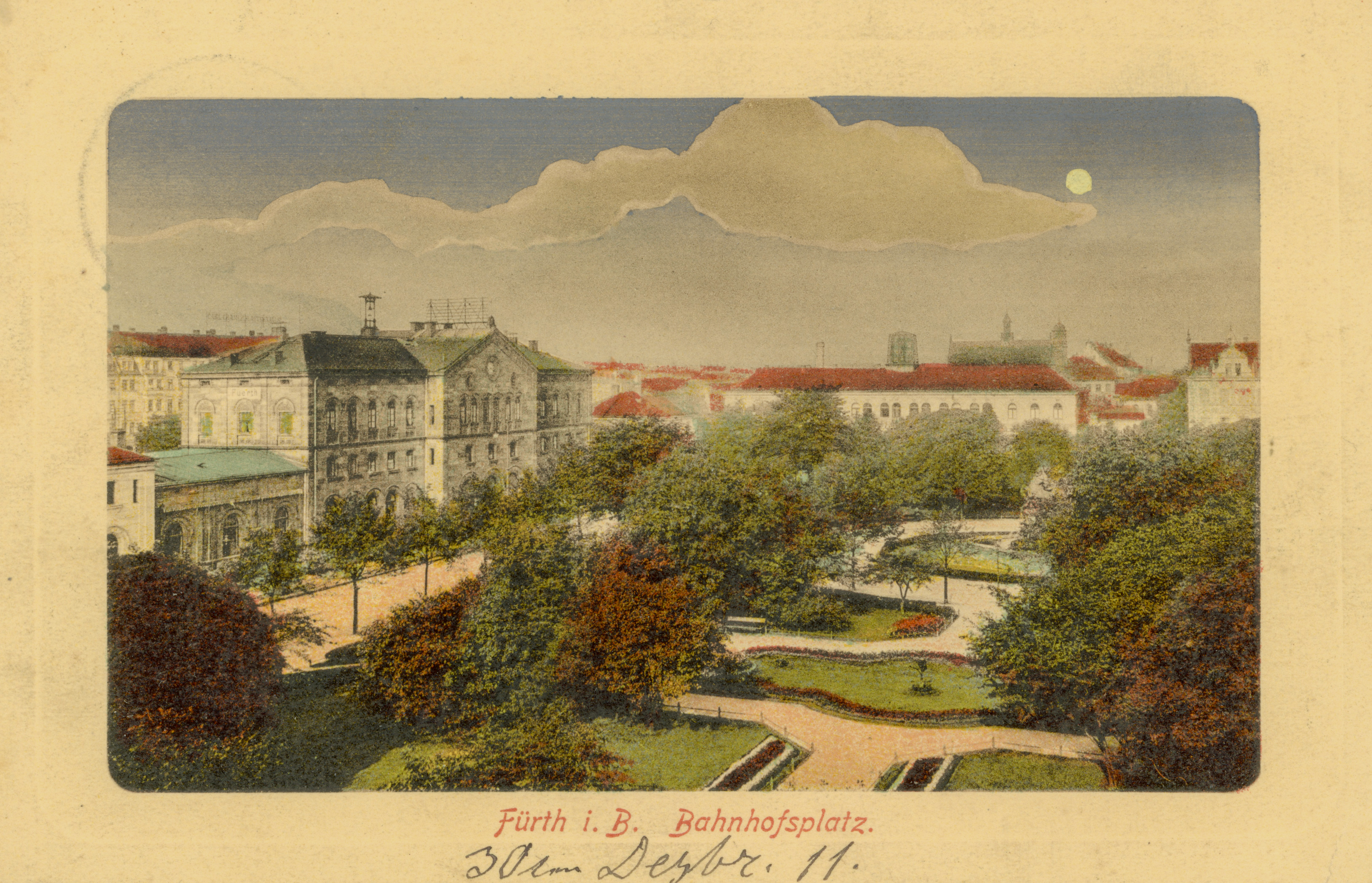 | Beschreibung | Der Bahnhofplatz bei Vollmond, gel. Dez 1911 | ||