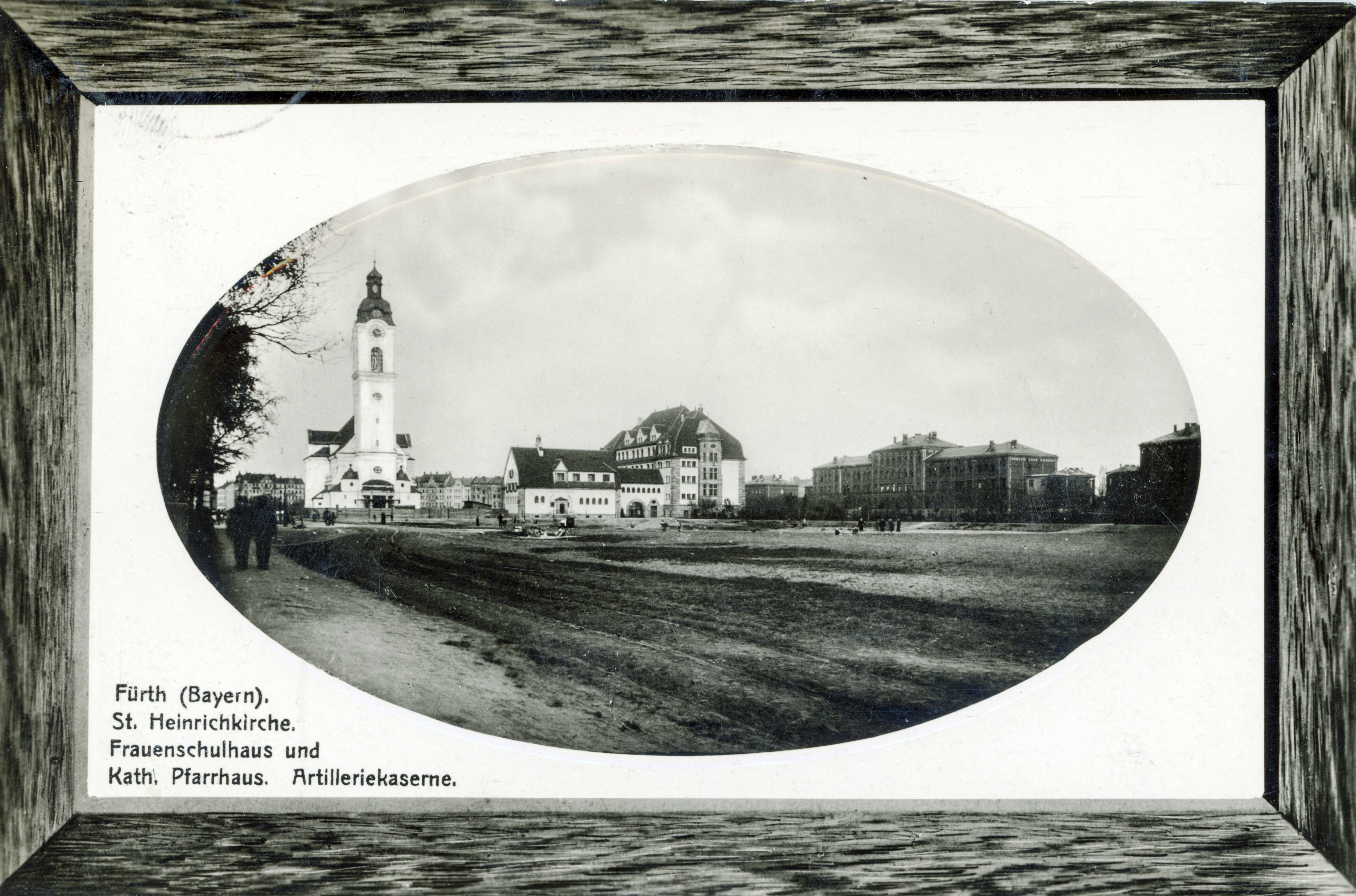 | Beschreibung | Die Kirche St. Heinrich in der Südstadt mit der Frauenschule, dem städtischen Brausebad und der Artilleriekaserne, gel. Aug. 1911 | ||