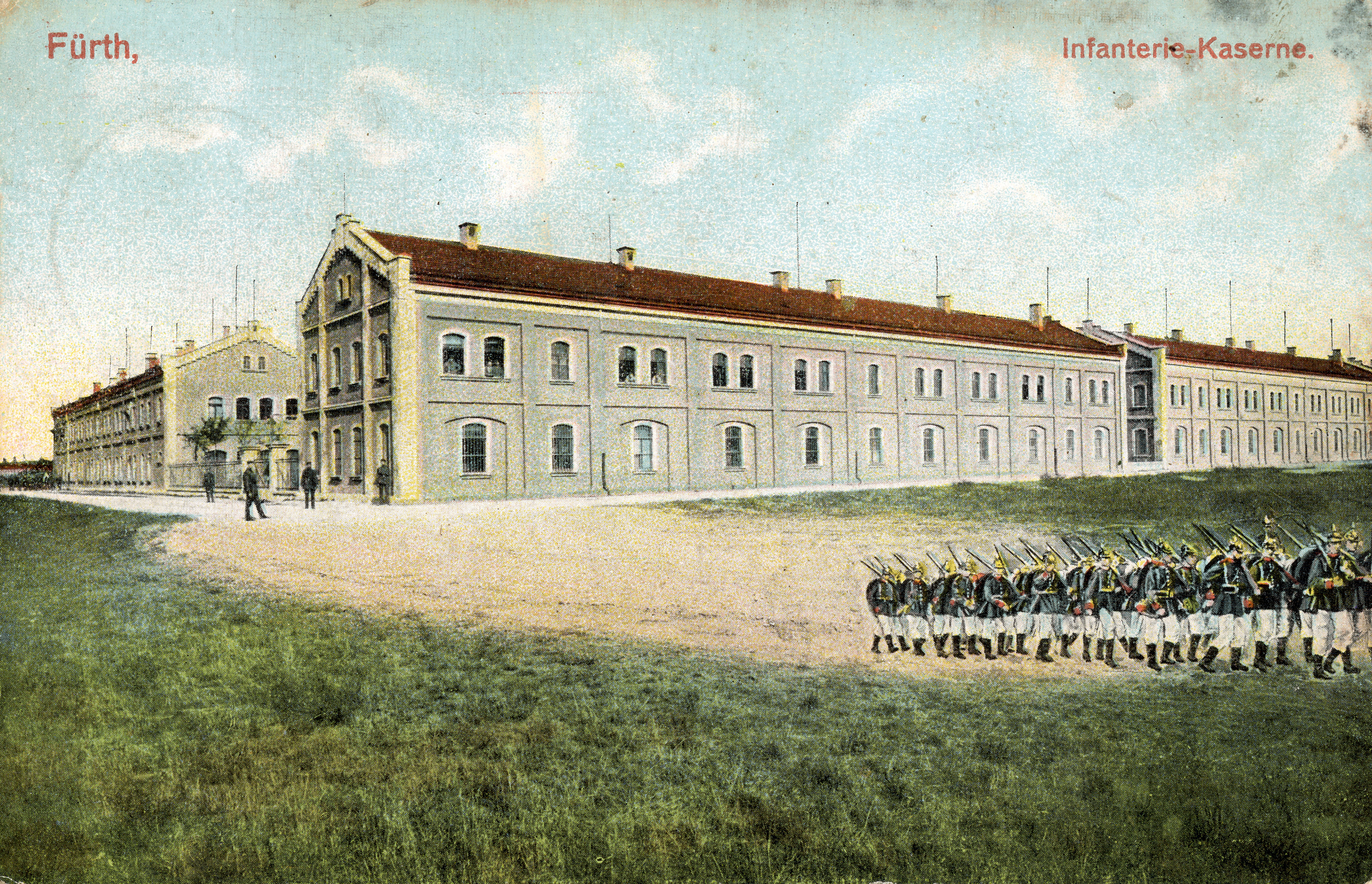 | Beschreibung | Die Infanteriekaserne in der Südstadt mit nachträglich retuschierten Soldaten und Färbung, gel. Jan 1915 | ||