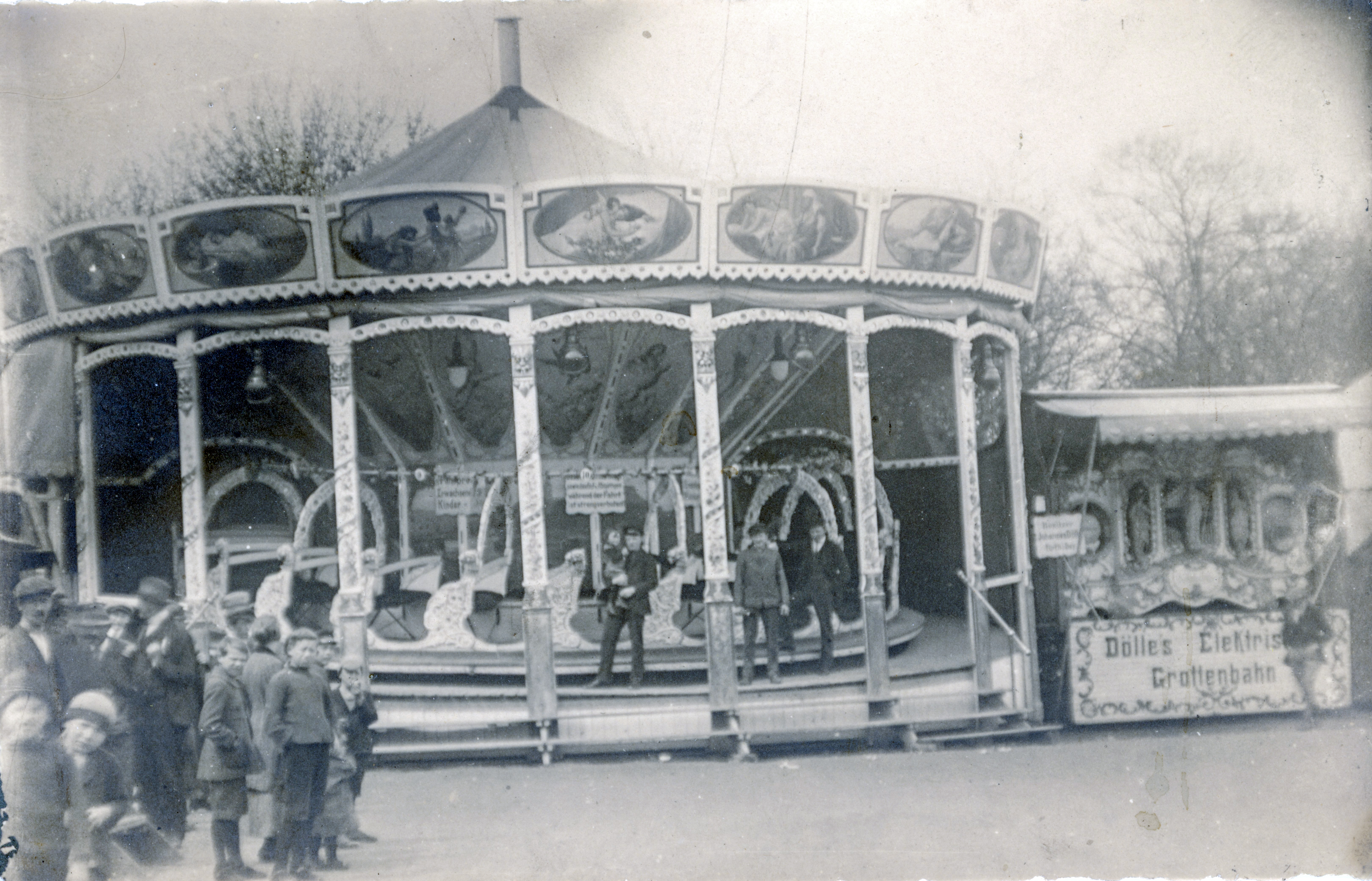 | Dateiinfo (Bild-Unterschrift und Info-Box, automatisch erstellt) | Karussell auf der Michaeliskirchweih - Dölle´s elektrische Grottenbahn, ngl. ca. 1930 Urheber: unbekannt<br><br>Lizenz: CC BY-SA 4.0 | ||