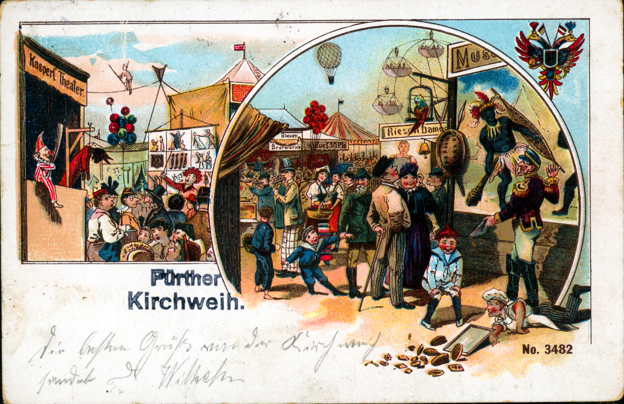 | Dateiinfo (Bild-Unterschrift und Info-Box, automatisch erstellt) | Gruß von der Fürther Kirchweih, historische Ansichtskarte, um 1900 Lizenz: CC BY-SA 3.0 | ||