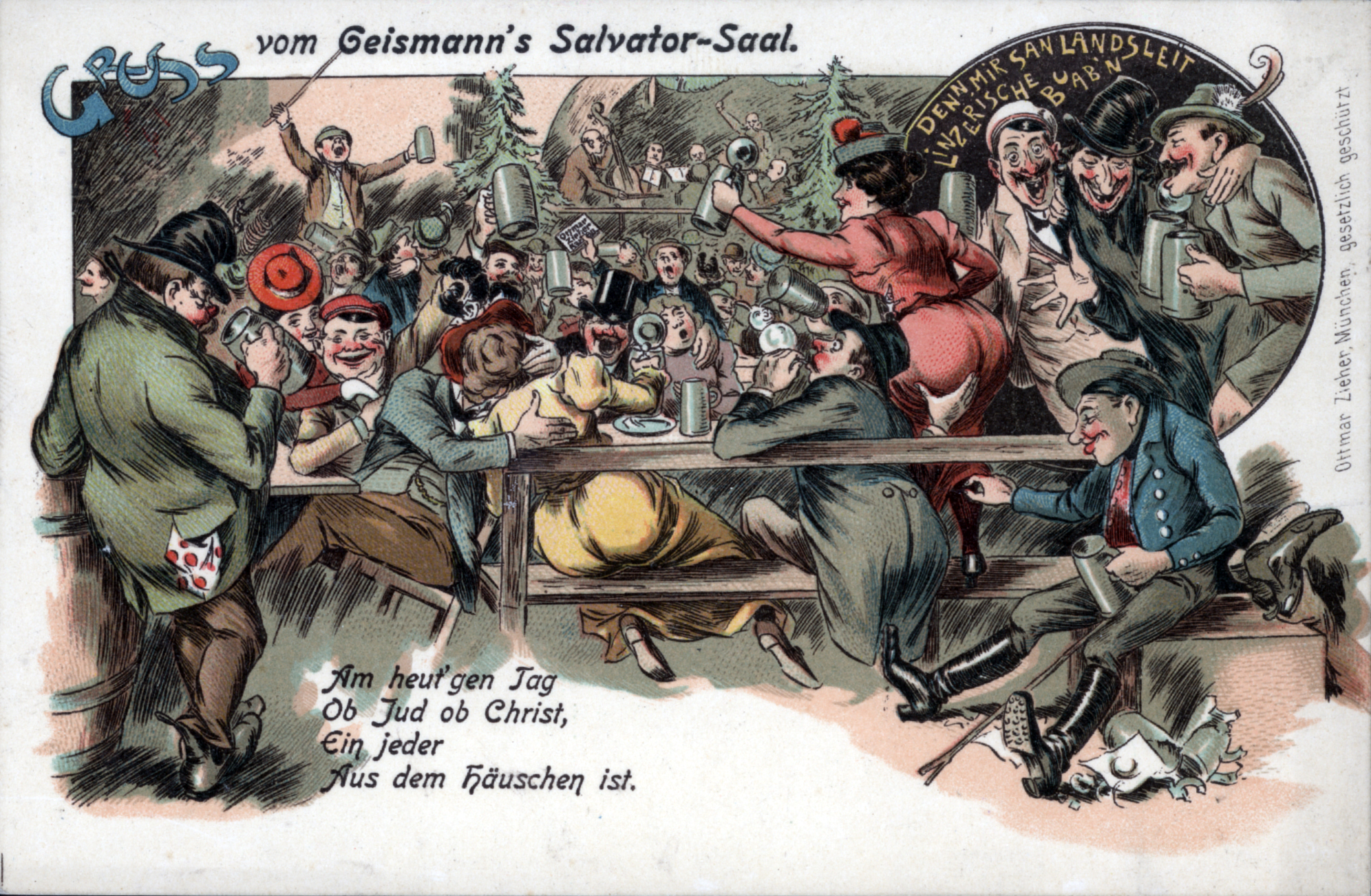 | Beschreibung | Gruß von der Fürther Kirchweih, historische Ansichtskarte gezeichnet mit einem Saufgelage im Geismannsaal mit leicht sexistischer Anspielung - aber folgendem Trinklied: Am heut´gen Tag, Ob Jud ob Christ, Ein jeder Aus dem Häuschen ist., um 1900 | ||