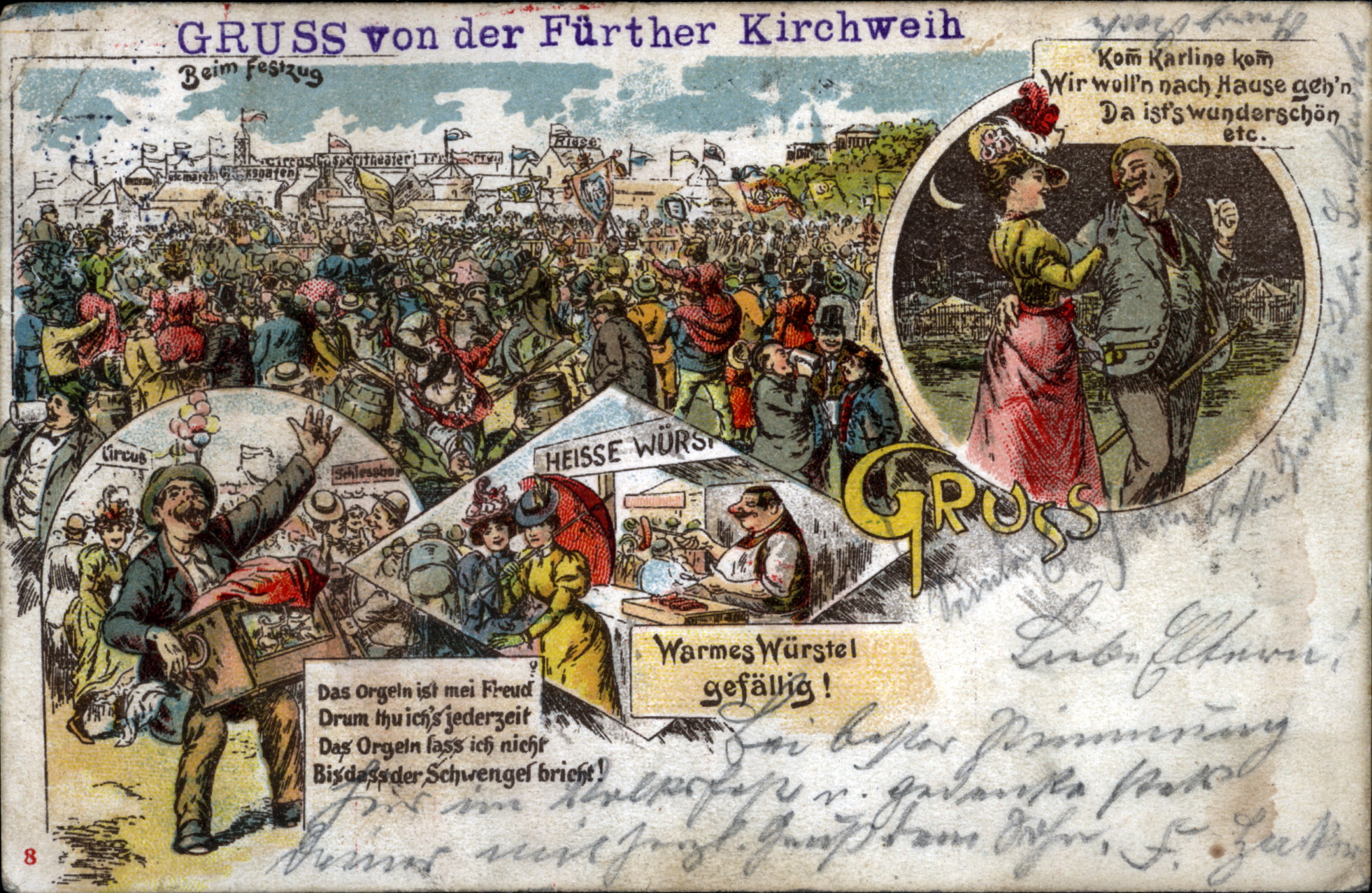 | Dateiinfo (Bild-Unterschrift und Info-Box, automatisch erstellt) | Gruß von der Fürther Kirchweih, historische Ansichtskarte, um 1900 Lizenz: CC BY-SA 3.0 | ||