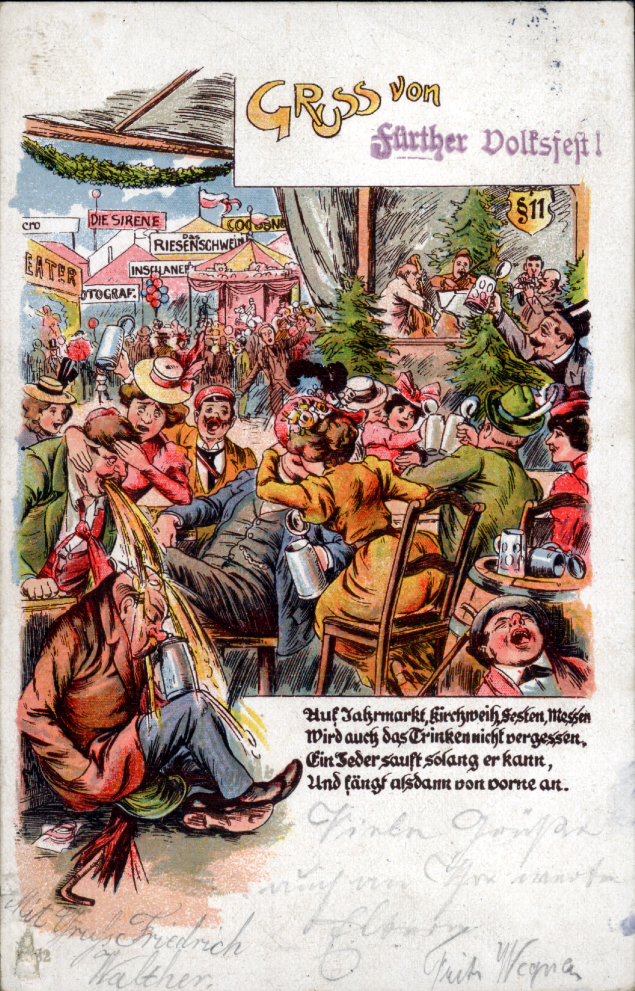 | Beschreibung | Gruß von der Fürther Kirchweih, historische Ansichtskarte mit Anspielung an den studentischen Trinkspruch § 11, um 1900 | ||