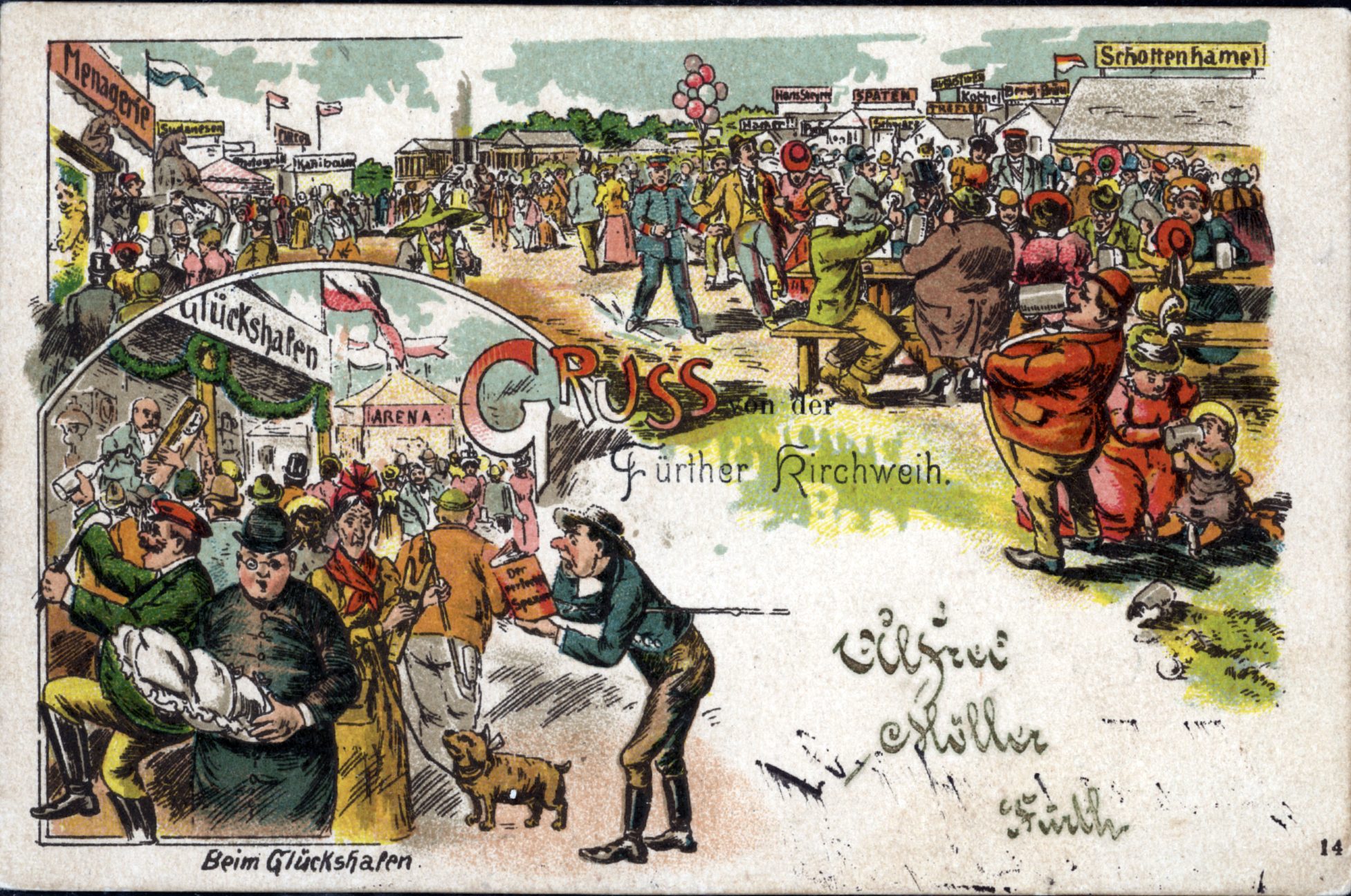 | Beschreibung | Gruß von der Fürther Kirchweih, historische Ansichtskarte, um 1900 (Im Hintergrund kurioserweise das Oktoberfest mit der Bavaria) | ||
