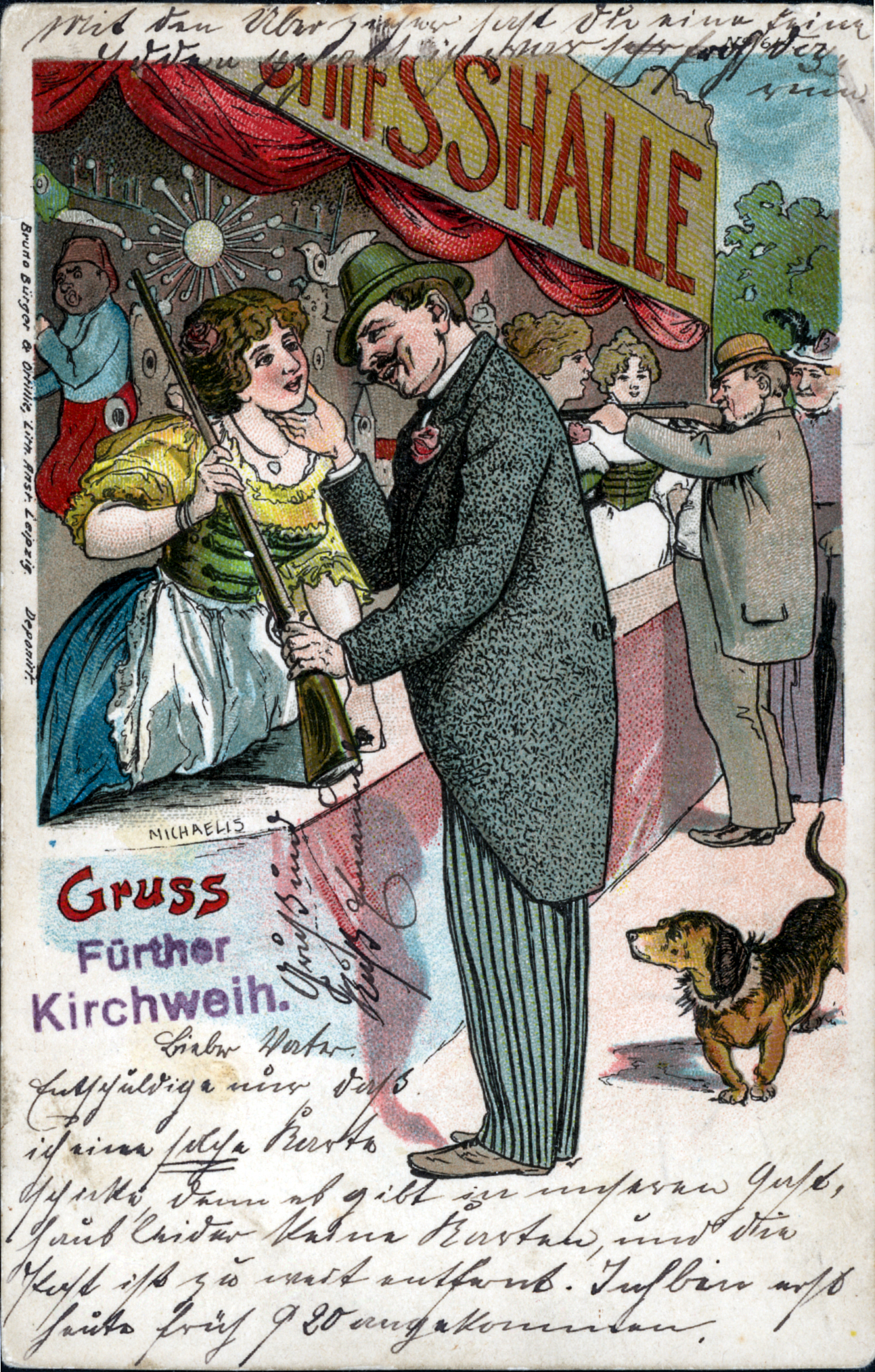 | Beschreibung | Gruß von der Fürther Kirchweih, historische Ansichtskarte gezeichnet mit einem Motiv am Schießstand, um 1905 | ||
