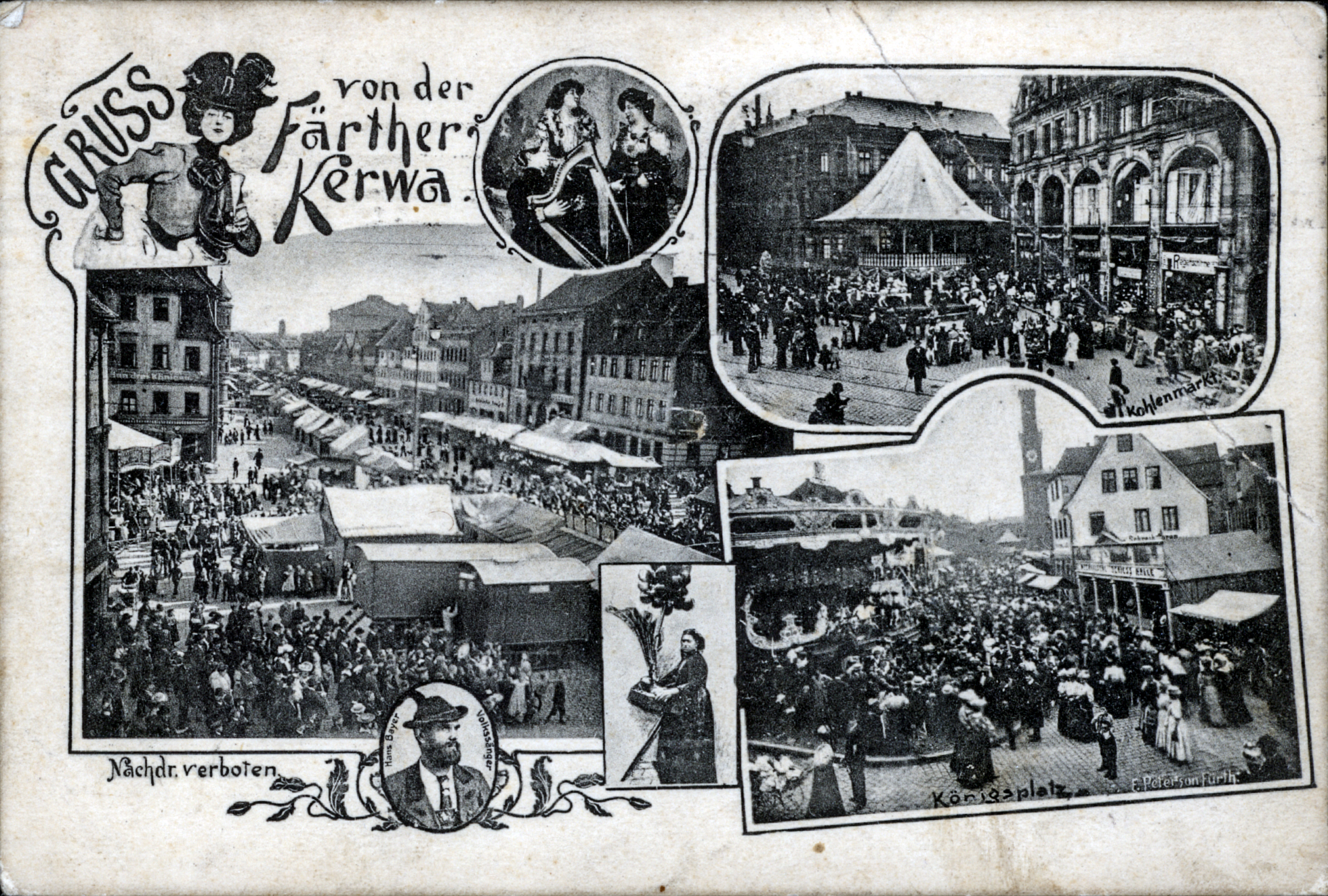 | Beschreibung | Gruß von der Fürther Kirchweih, historische Ansichtskarte mit Fotografien am Kohlenmarkt; Königsplatz und in der Königstraße und Volkssänger Hans Bayer, um 1905 | ||