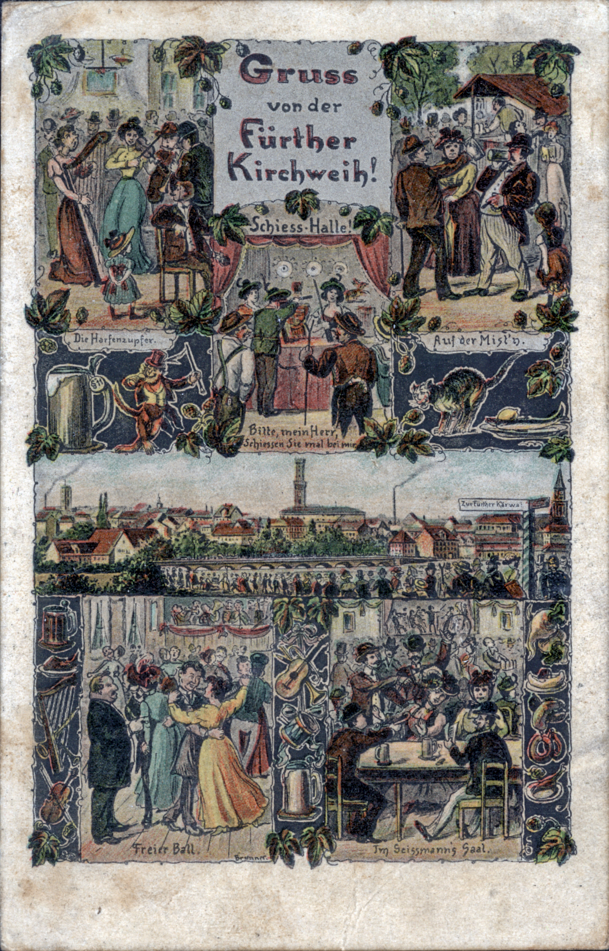 | Beschreibung | Gruß von der Fürther Kirchweih, historische Ansichtskarte gezeichnet mit Affe und Kater sowie Geismann-Saal und Harfenspielerinnen, um 1905 | ||
