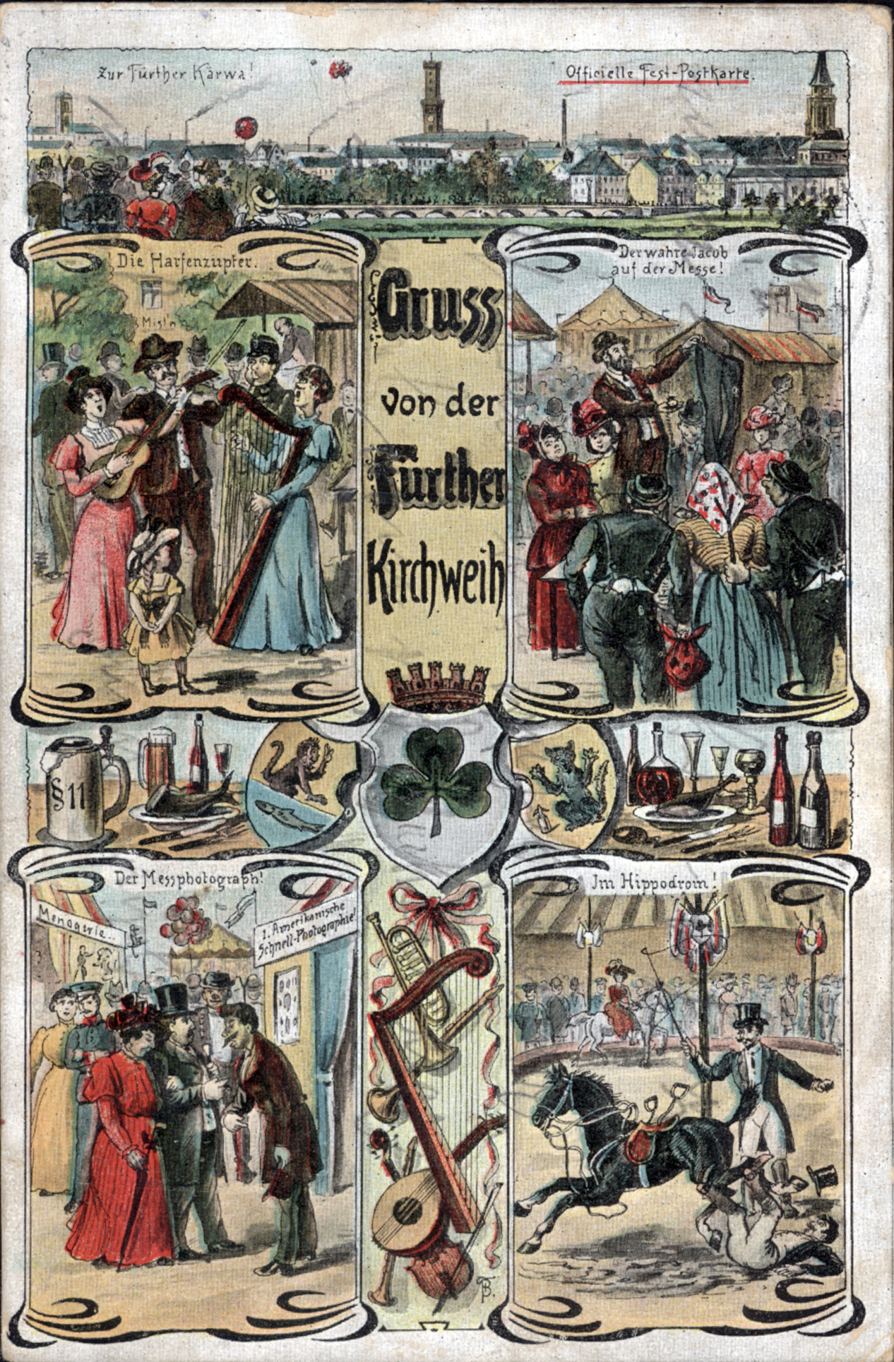 | Beschreibung | Gruß von der Fürther Kirchweih, historische Ansichtskarte mit Hippodrom, dem Billigen Jakob und Harfenspielerinnen, um 1905 | ||