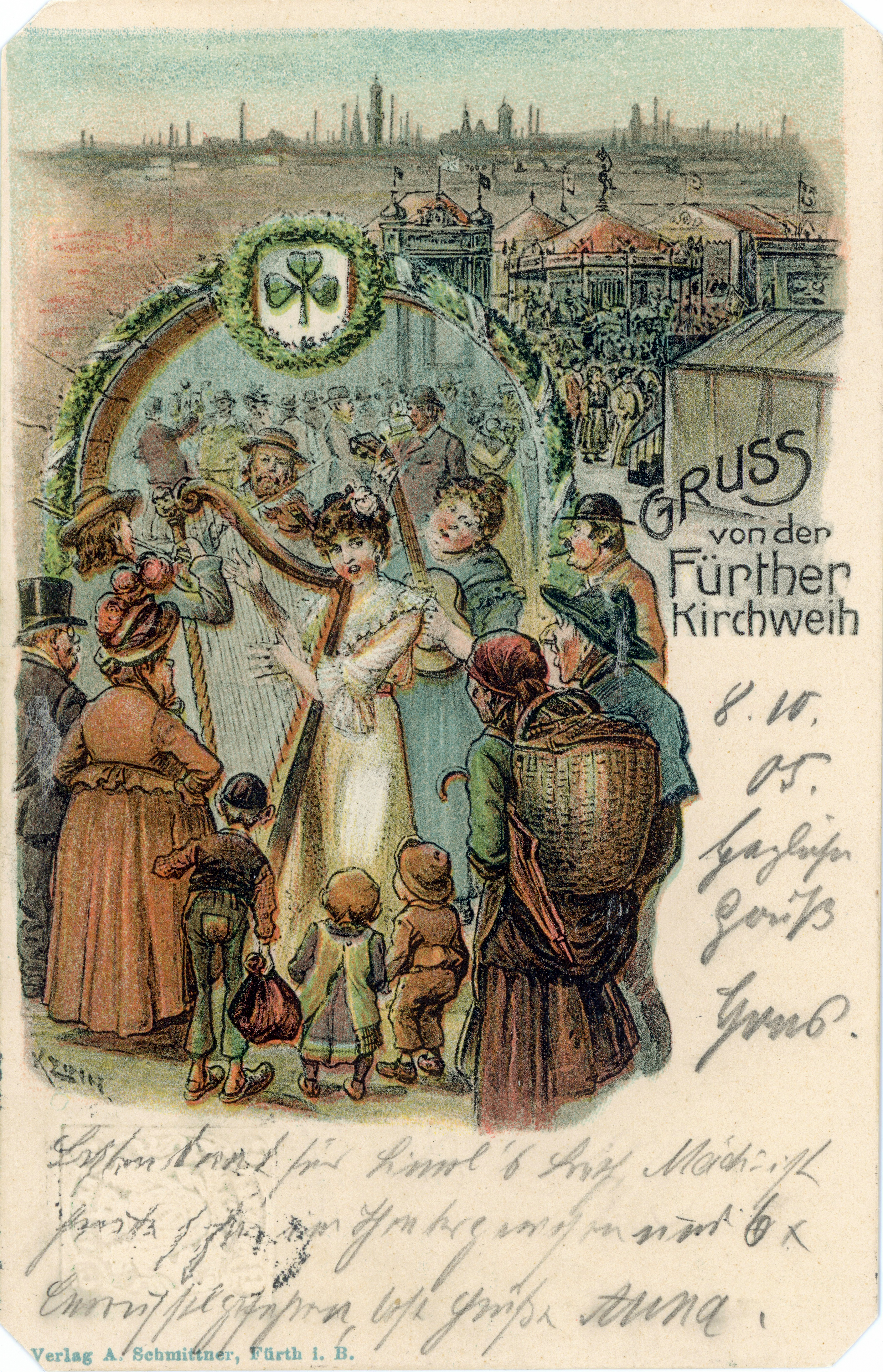 | Beschreibung | Gruß von der Fürther Kirchweih, historische Ansichtskarte mit Harfenspielerin, 1905 | ||