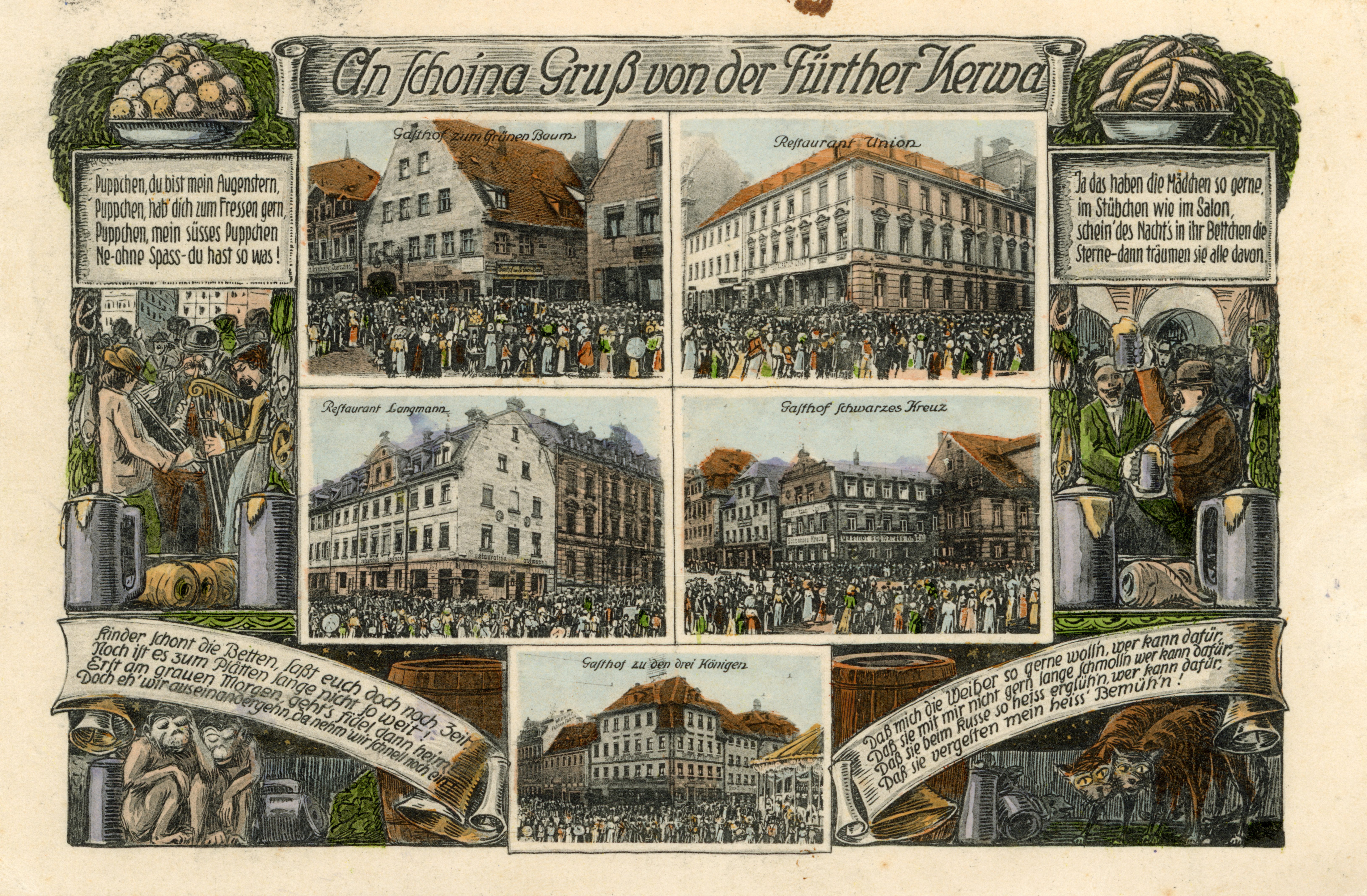 | Beschreibung | Gruß von der Fürther Kirchweih, historische Ansichtskarte mit diversen Gaststätten und Katzen- und Affenmotiv, um 1905 | ||