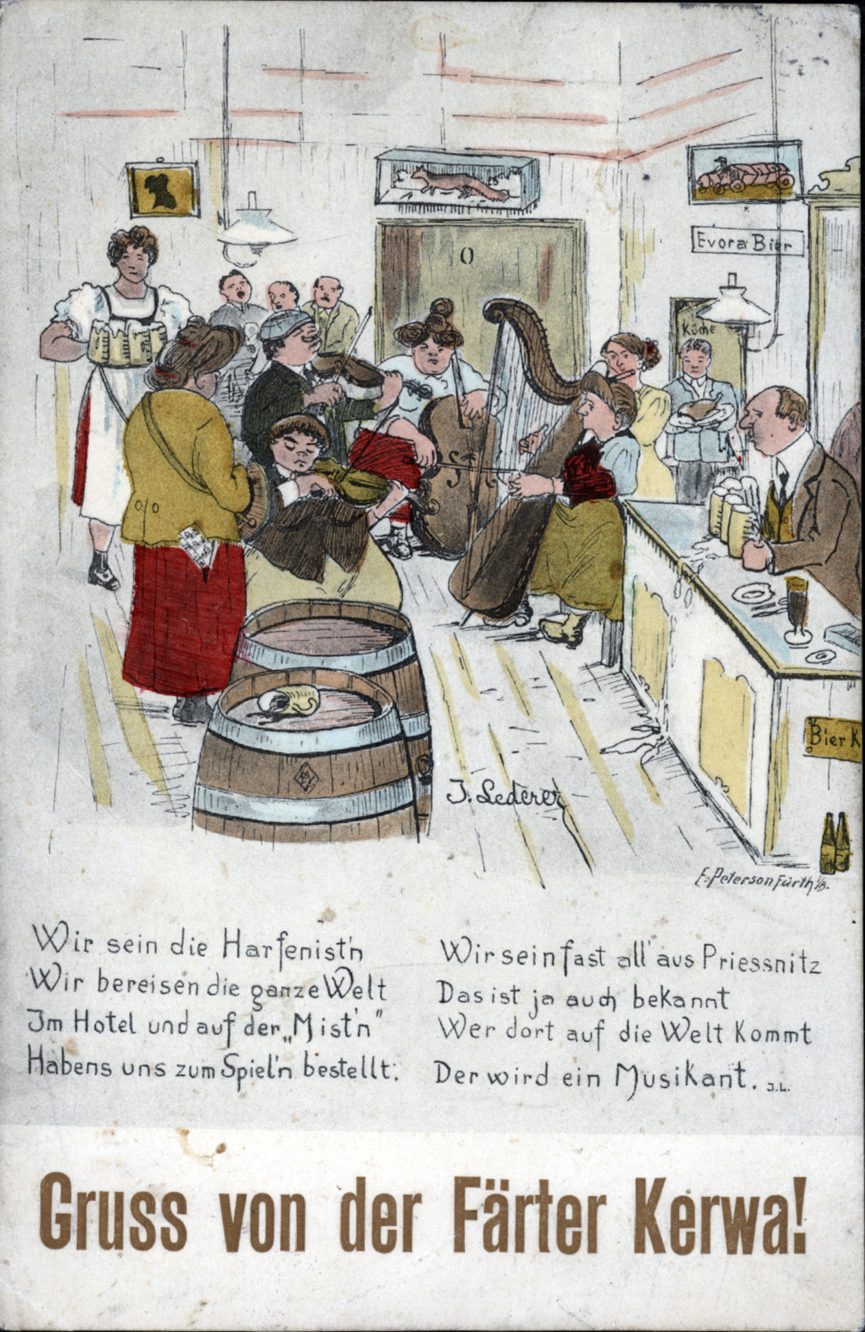 | Beschreibung | Gruß von der Fürther Kirchweih, historische gezeichnete Ansichtskarte vom Fürther Maler Jean Lederer - Szene in einer Kneipe, um 1910 | ||