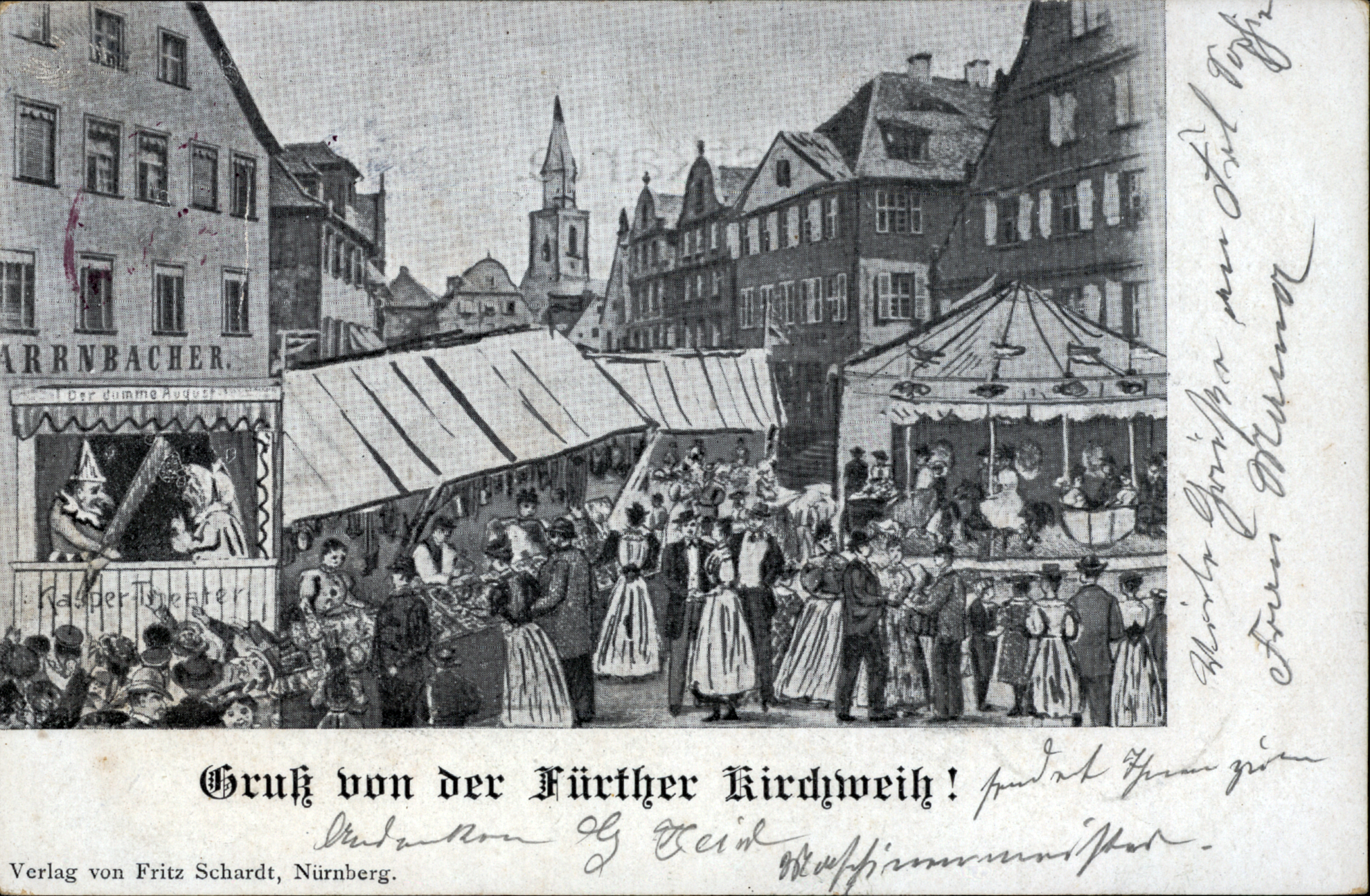 | Beschreibung | Gruß von der Fürther Kirchweih, historische Ansichtskarte als Fotocollage - Kirchweih am Grünen Markt, um 1910 | ||