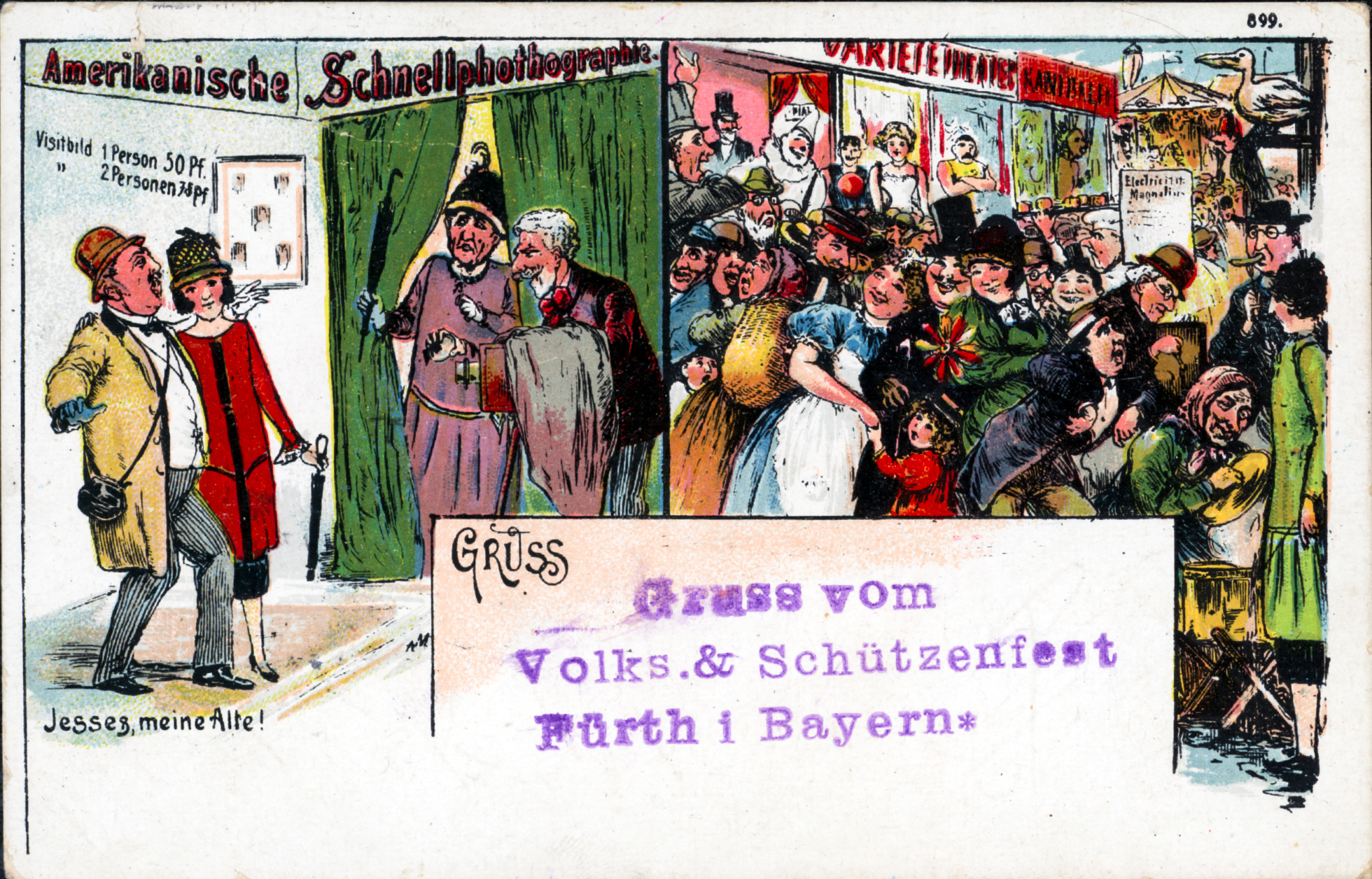 | Beschreibung | Gruß von der Fürther Kirchweih, historische Ansichtskarte mit Schnellfotograf auf der Kirchweih für sog. Carte de Visite, um 1900 | ||