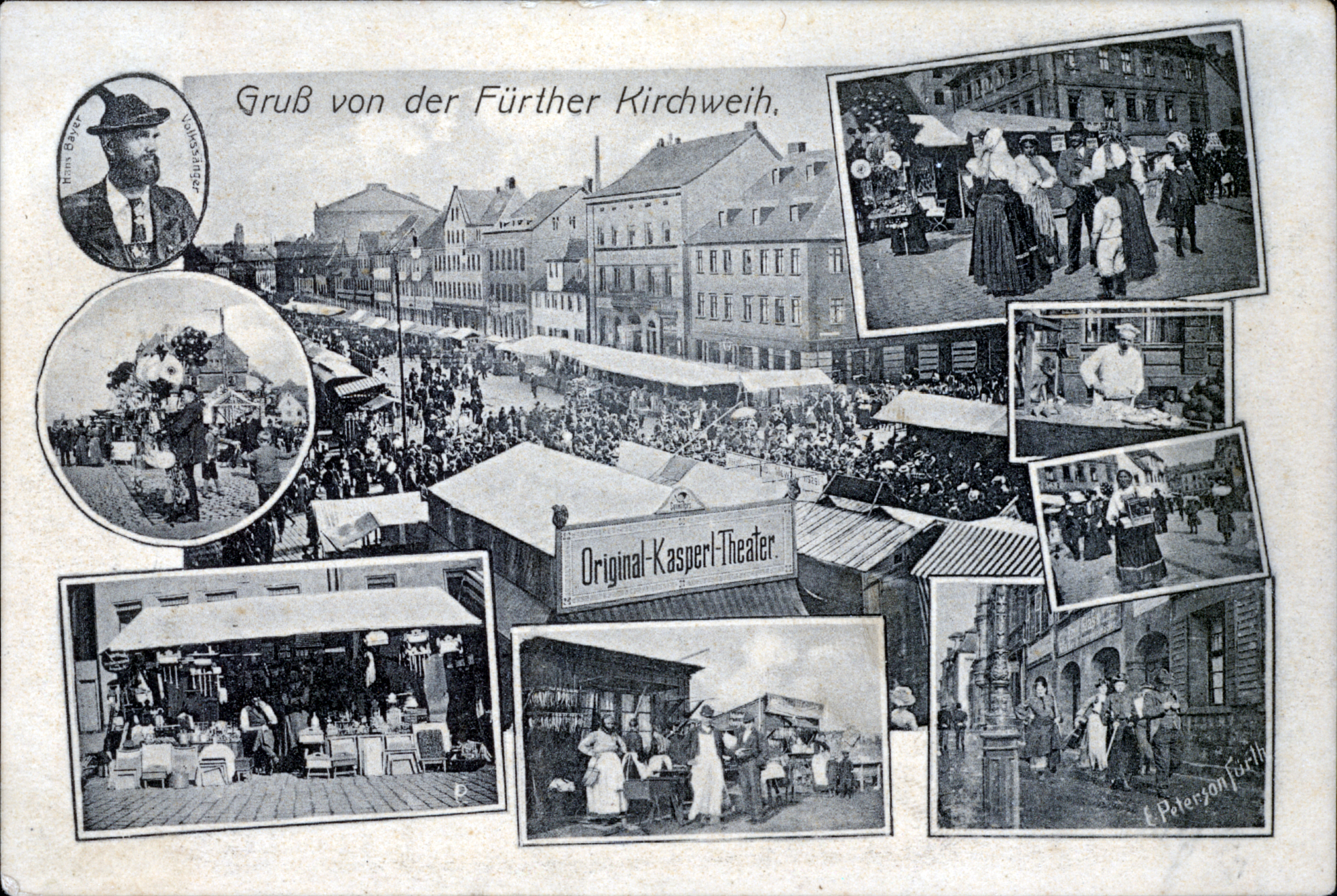 | Beschreibung | Gruß von der Fürther Kirchweih, historische Ansichtskarte mit Fotos von Eugen Peterson, um 1920 | ||