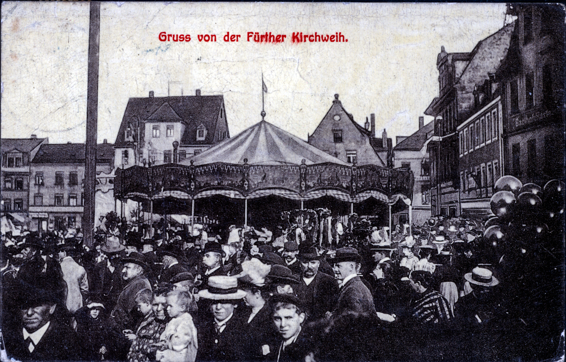 | Beschreibung | Gruß von der Fürther Kirchweih, historische Ansichtskarte vom Königsplatz bzw. von der Helmstraße, um 1920 | ||