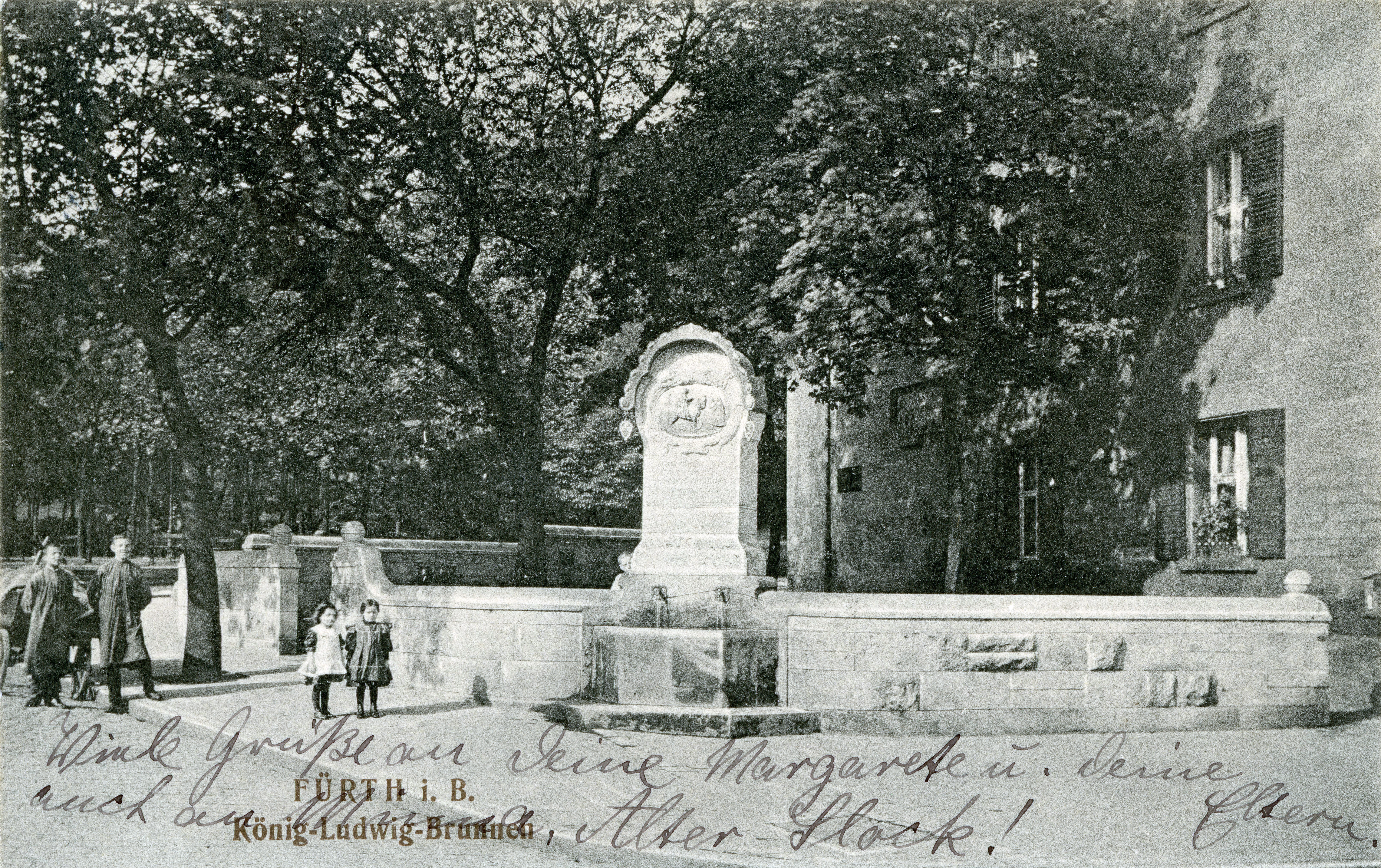 | Beschreibung | Der König-Ludwig-Brunnen in der Königstraße, Ecke Gustav-Schickedanz-Straße auf einer alten Ansichtskarte, im Hintergrund die Englische Anlage bzw. die heutige Dr.-Konrad-Adenauer-Anlage, gel. 1911 | ||