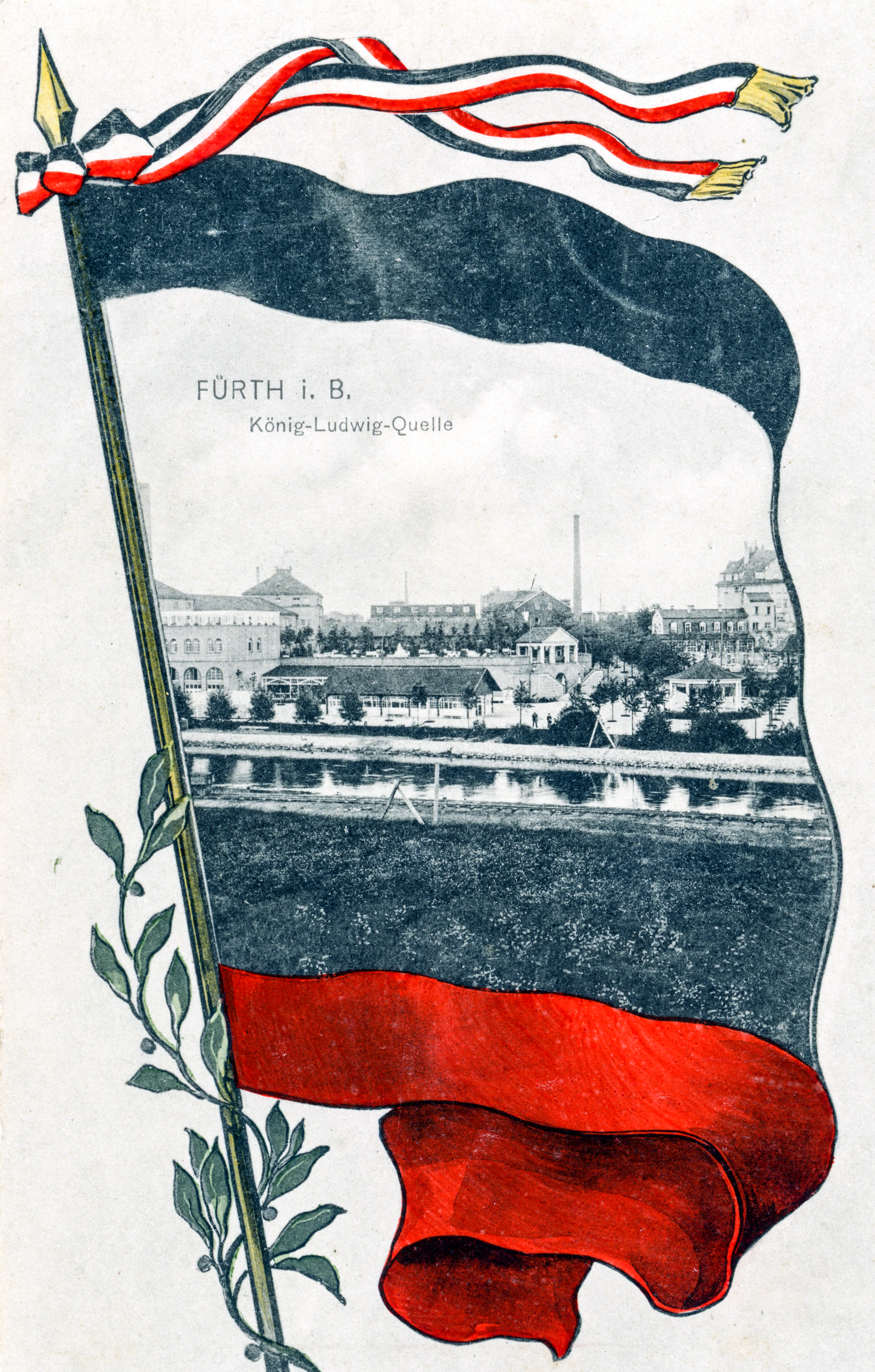 | Beschreibung | Ansichtskarte von der König-Ludwig-Quelle I mit den Reichsfarben, gel. 14. Aug. 1916 | ||