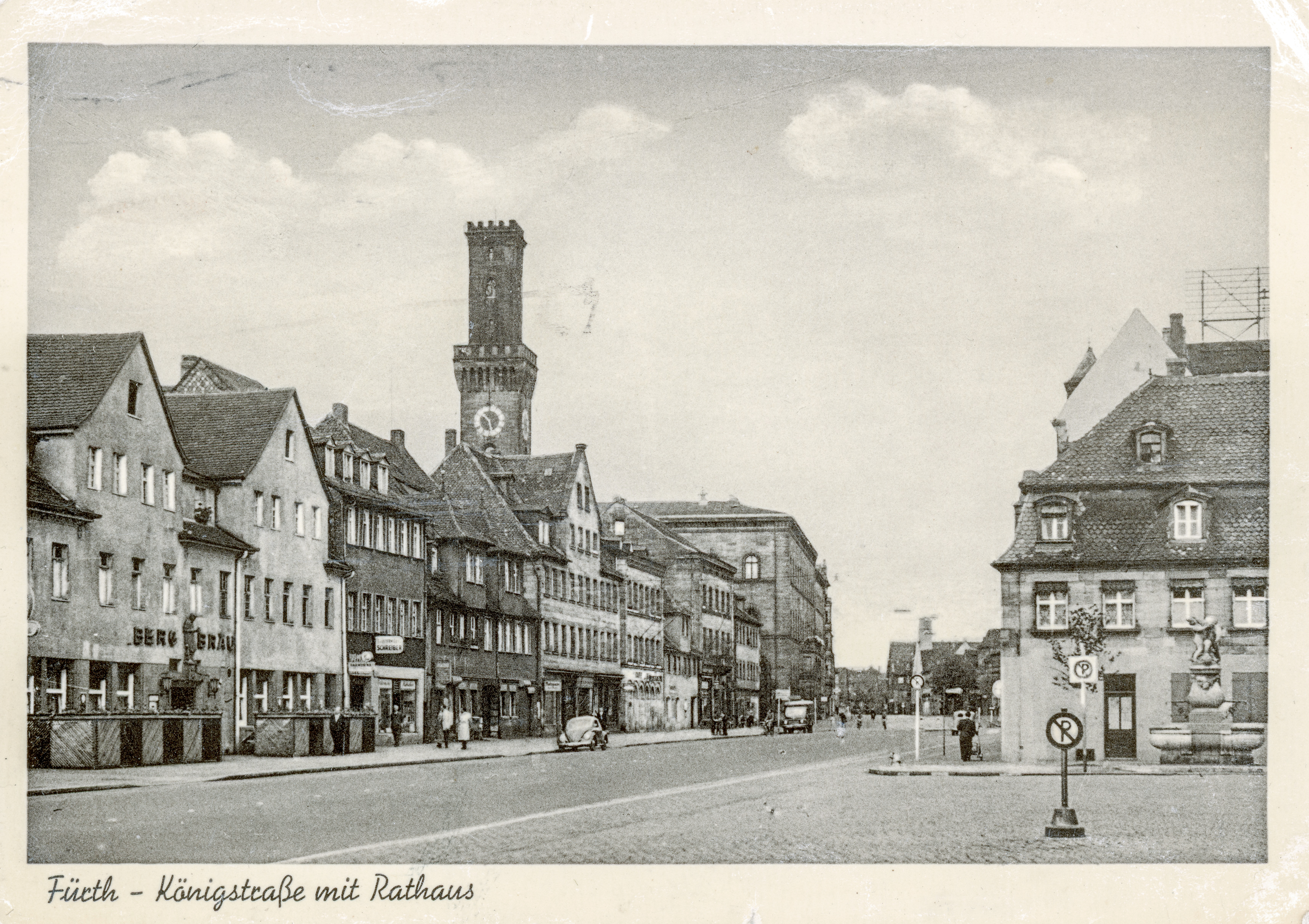 | Dateiinfo (Bild-Unterschrift und Info-Box, automatisch erstellt) | Blick in die Königstraße, im Hintergrund das Rathaus, gel. Juli 1955 Urheber: unbekannt<br><br>Lizenz: CC BY-SA 4.0 | ||