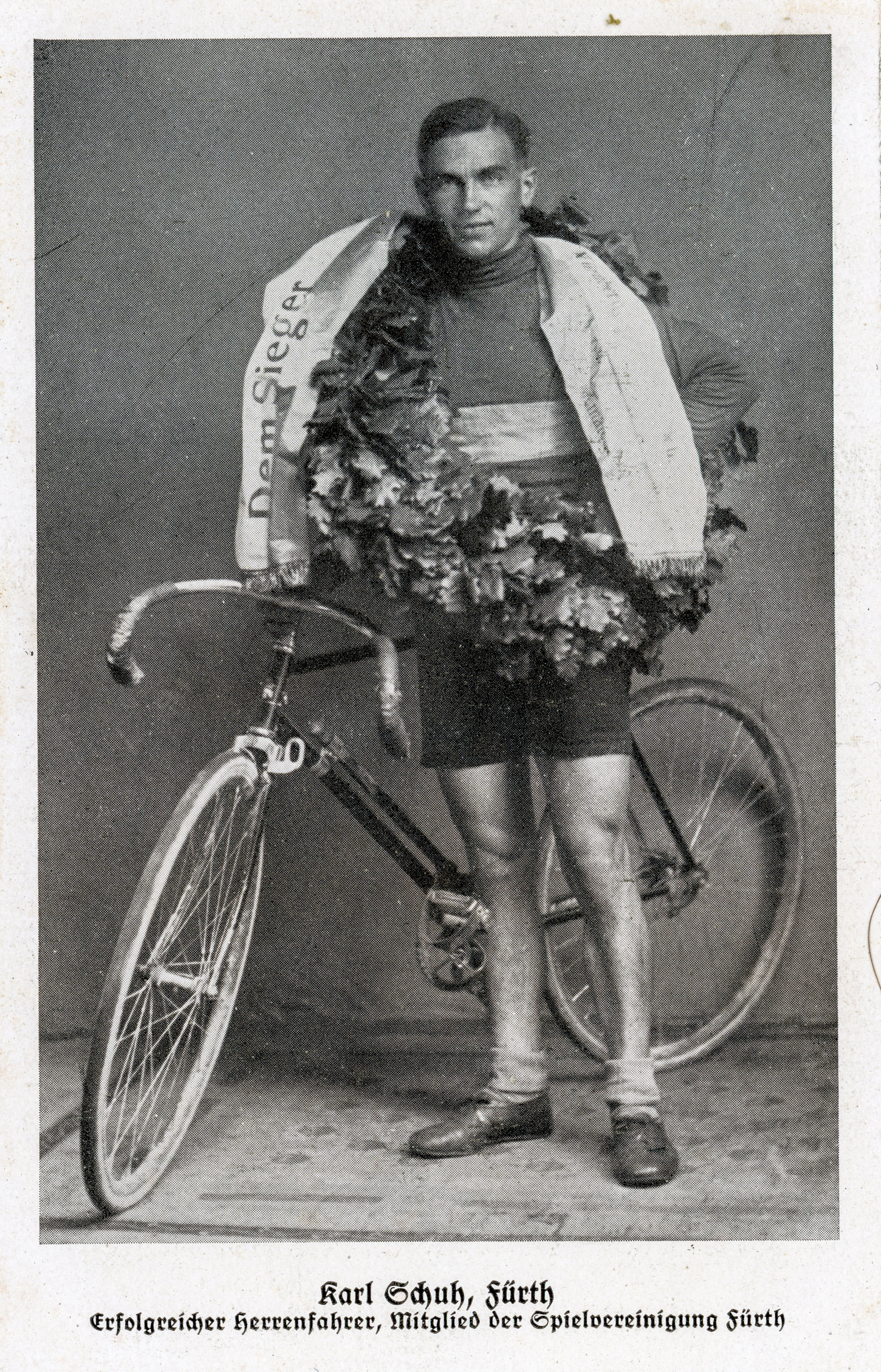 | Beschreibung | Karl Schuh, erfolgreicher Fahrradfahrer der Spielvereinigung Fürth, ca. 1930 | ||