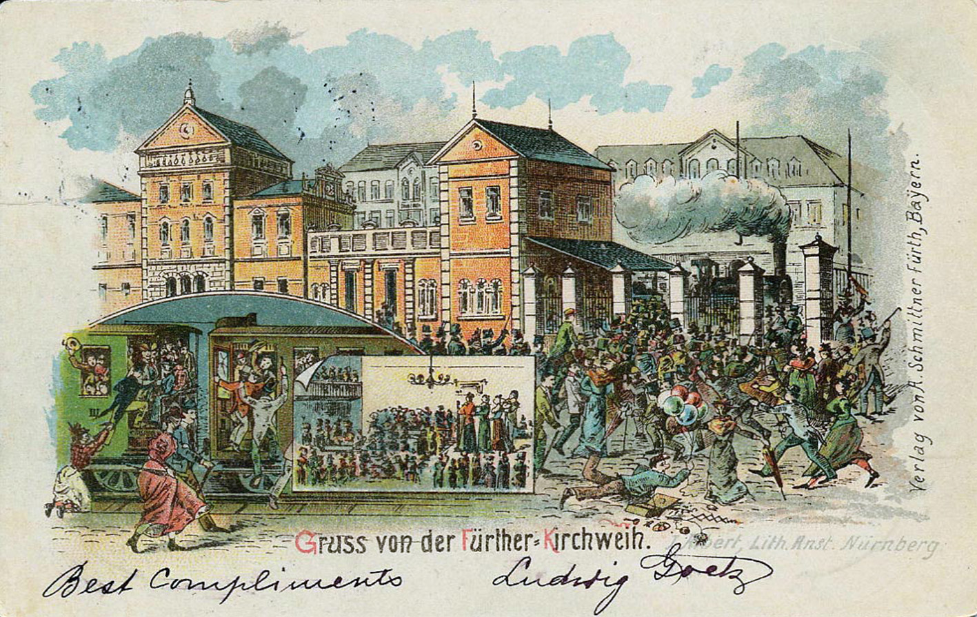 | Dateiinfo (Bild-Unterschrift und Info-Box, automatisch erstellt) | Gruß von der Fürther Kirchweih, historische Ansichtskarte, 1897 Lizenz: CC BY-SA 3.0 | ||